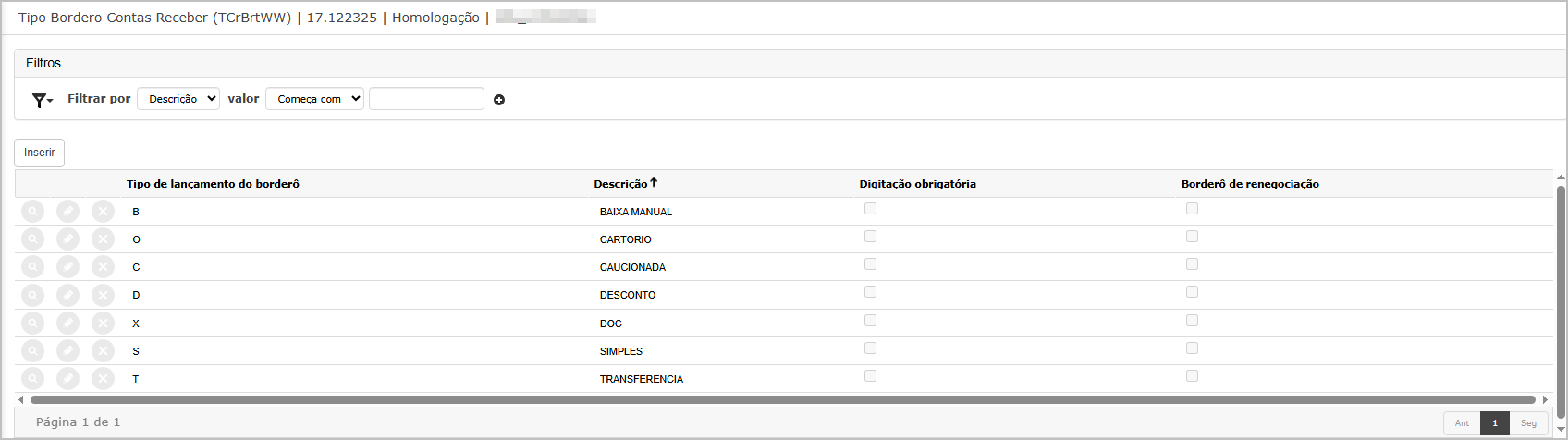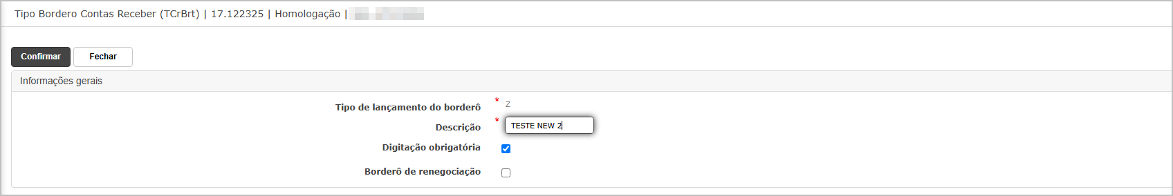 Para adicionar um novo tipo de borderô, clique em Inserir, preencha os campos obrigatórios e clique em Confirmar.