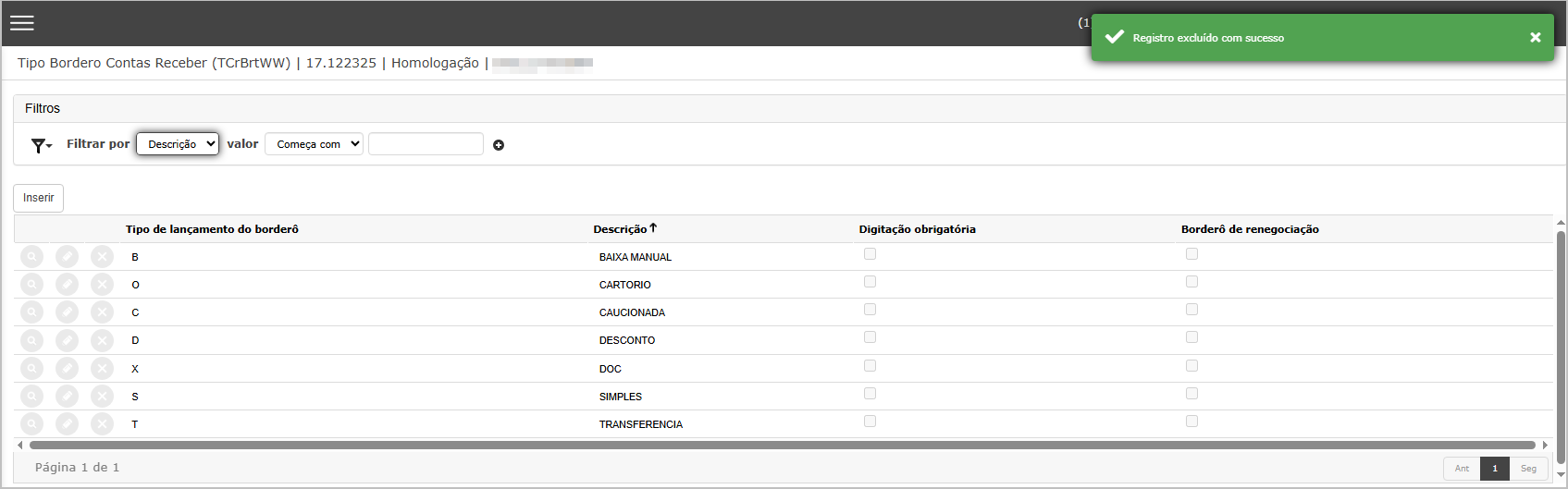 Exclusão de Tipo de Borderô
