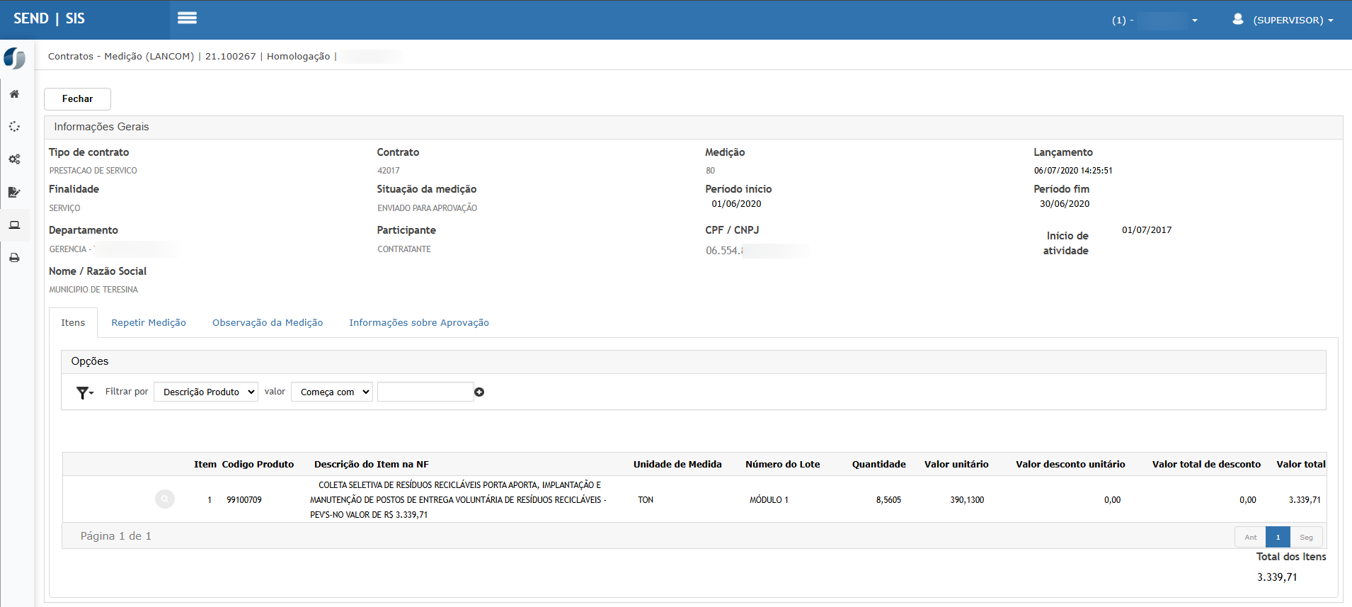 | Situação da medição | Exibe status atual (ex: Enviado para aprovação). |