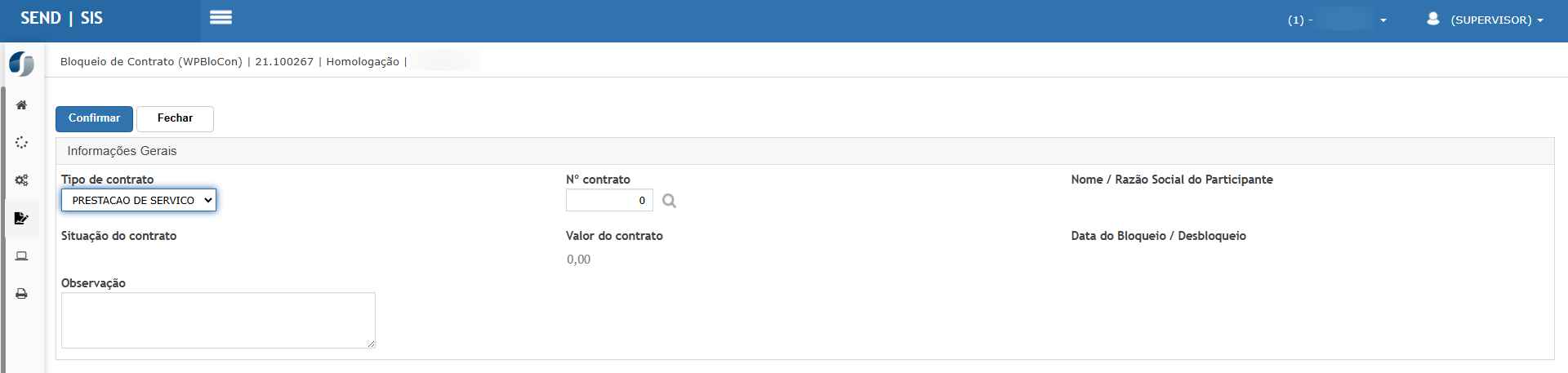 | Confirmar | Efetiva o bloqueio do contrato selecionado. Requer preenchimento correto dos campos obrigatórios. |