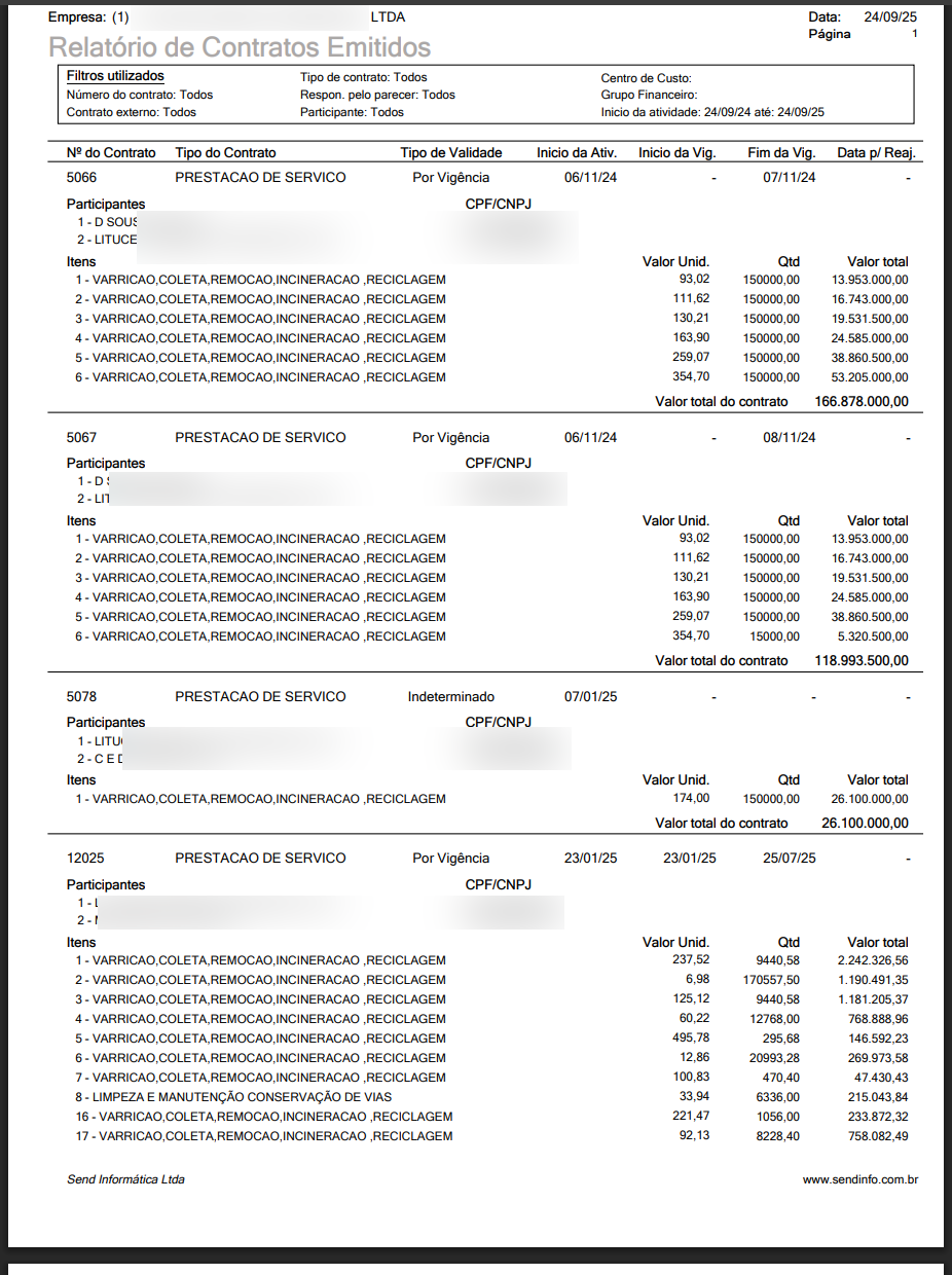 📝 No final da listagem, o relatório apresenta o valor total dos contratos listados, facilitando análises financeiras e de planejamento.