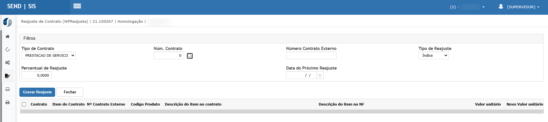 O botão Gravar Reajuste só estará habilitado após o preenchimento correto dos filtros obrigatórios.