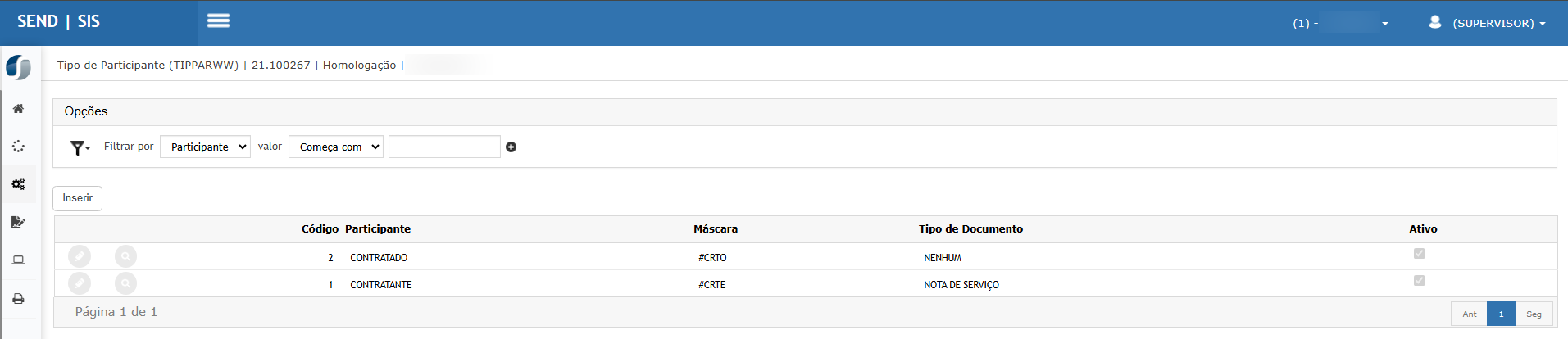 A tela Tipo de Participante permite o cadastro e a manutenção dos tipos de participantes envolvidos em contratos, como Contratante e Contratado. Essa definição é fundamental para estruturar o relacionamento entre as partes no contrato, identificar responsabilidades, aplicar máscaras de códigos e vincular tipos de documentos fiscais, quando necessário.