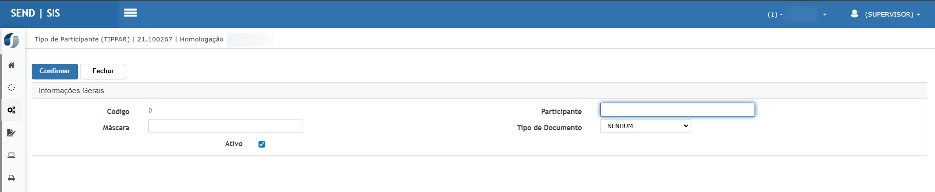 Permite o cadastro de um novo tipo de participante. Ao clicar no botão, o sistema direciona para uma nova tela onde devem ser informados os seguintes campos: