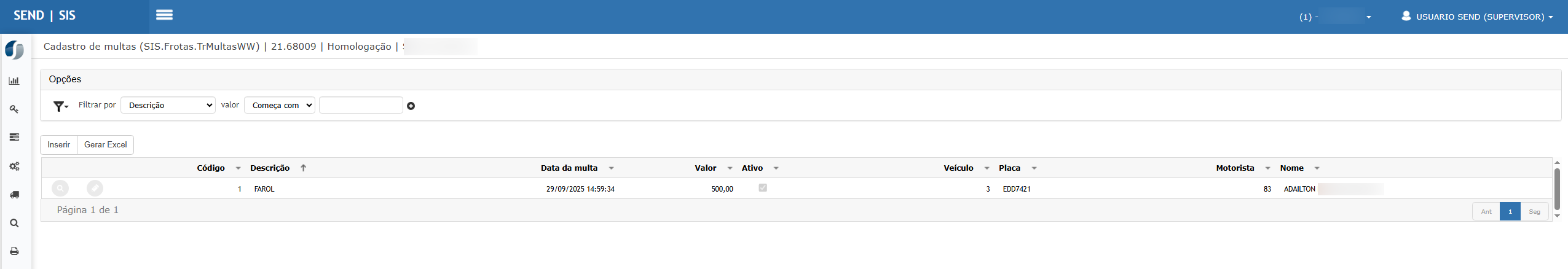 Filtro → permite localizar multas por descrição ou outros critérios.