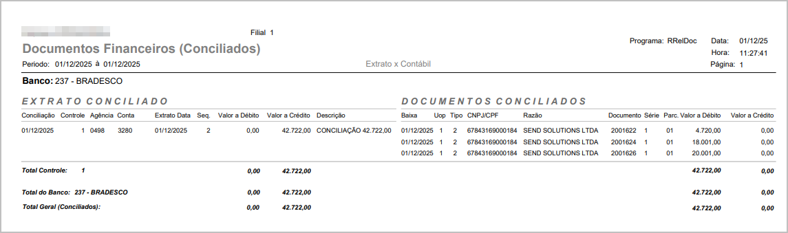 No relatório de documentos conciliados, note que é exibido o item conciliado corretamente.