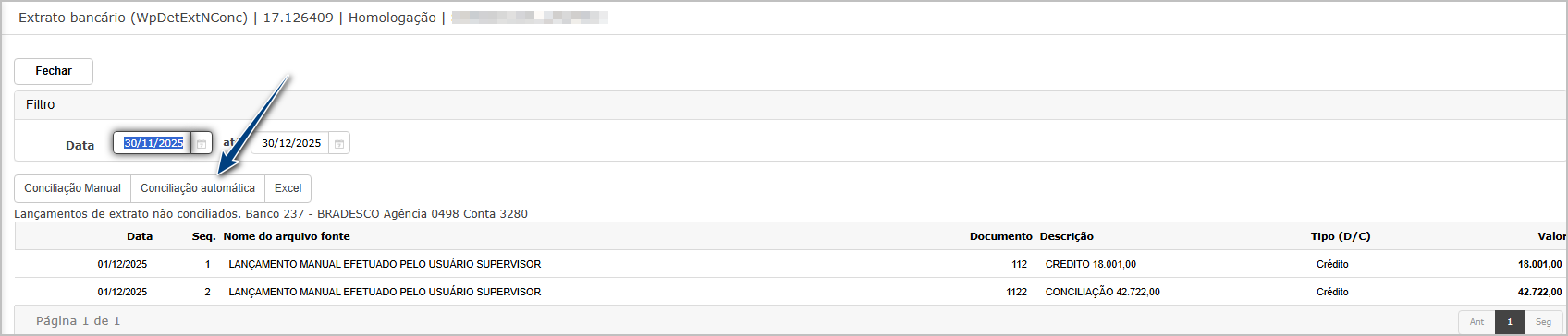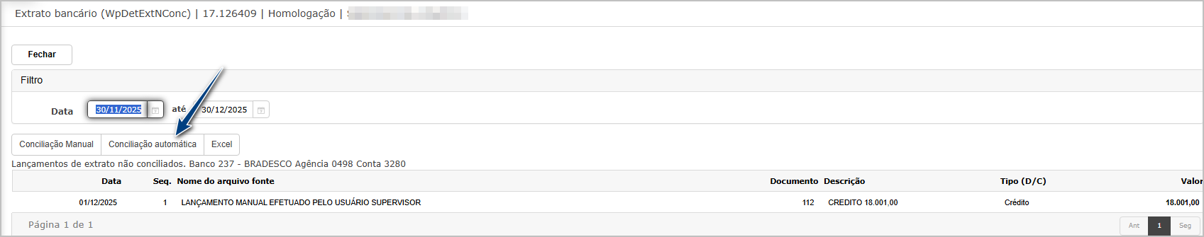 Ao abrir a tela do banco/agência/conta, clique no botão Conciliação Automática.