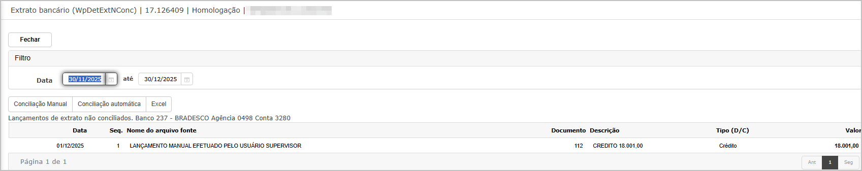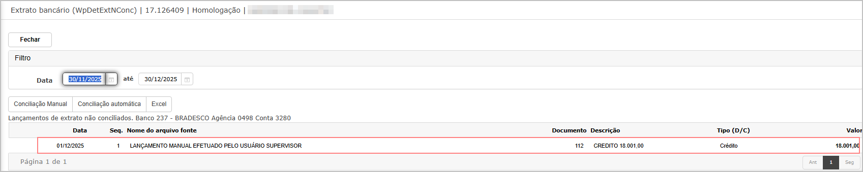 Ao entrar para fazer uma nova conciliação, note que lançamento ainda continua pendente.