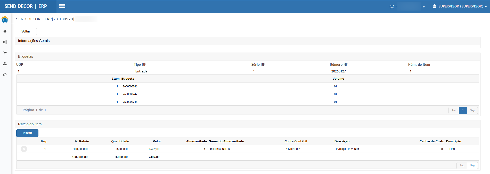 Resultado esperado: etiquetas geradas e, ao retornar/atualizar o recebimento, itens passam a carregar.