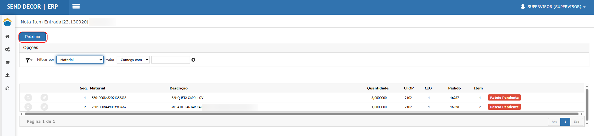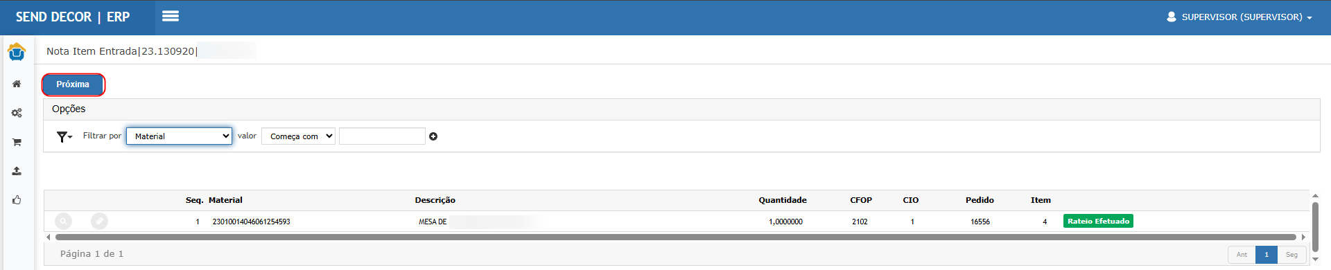 Resultado esperado: item relacionado e segue para rateio.