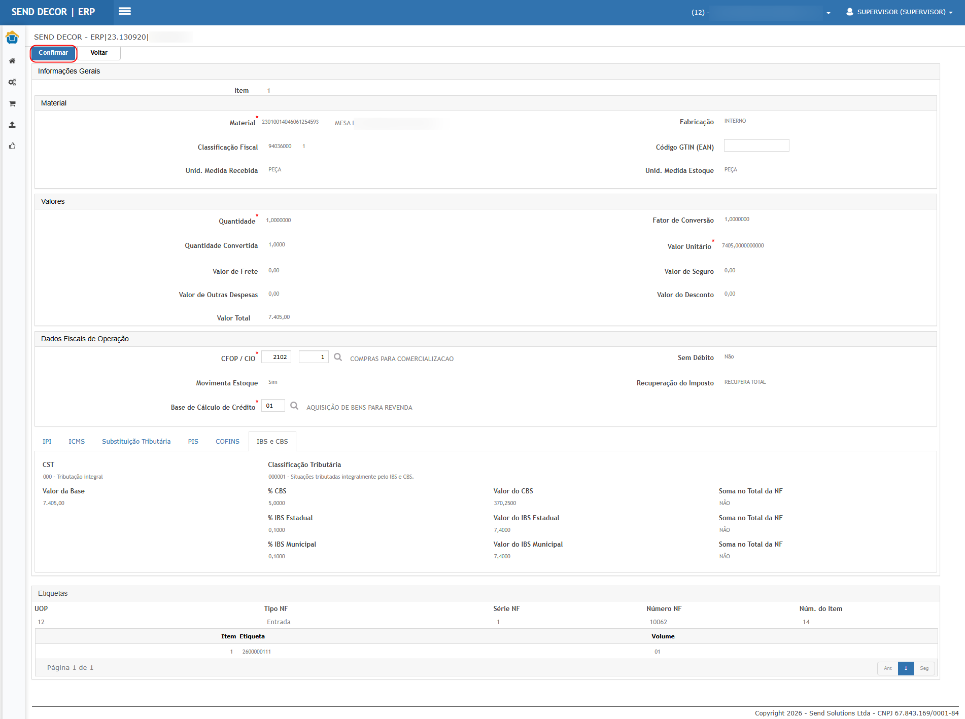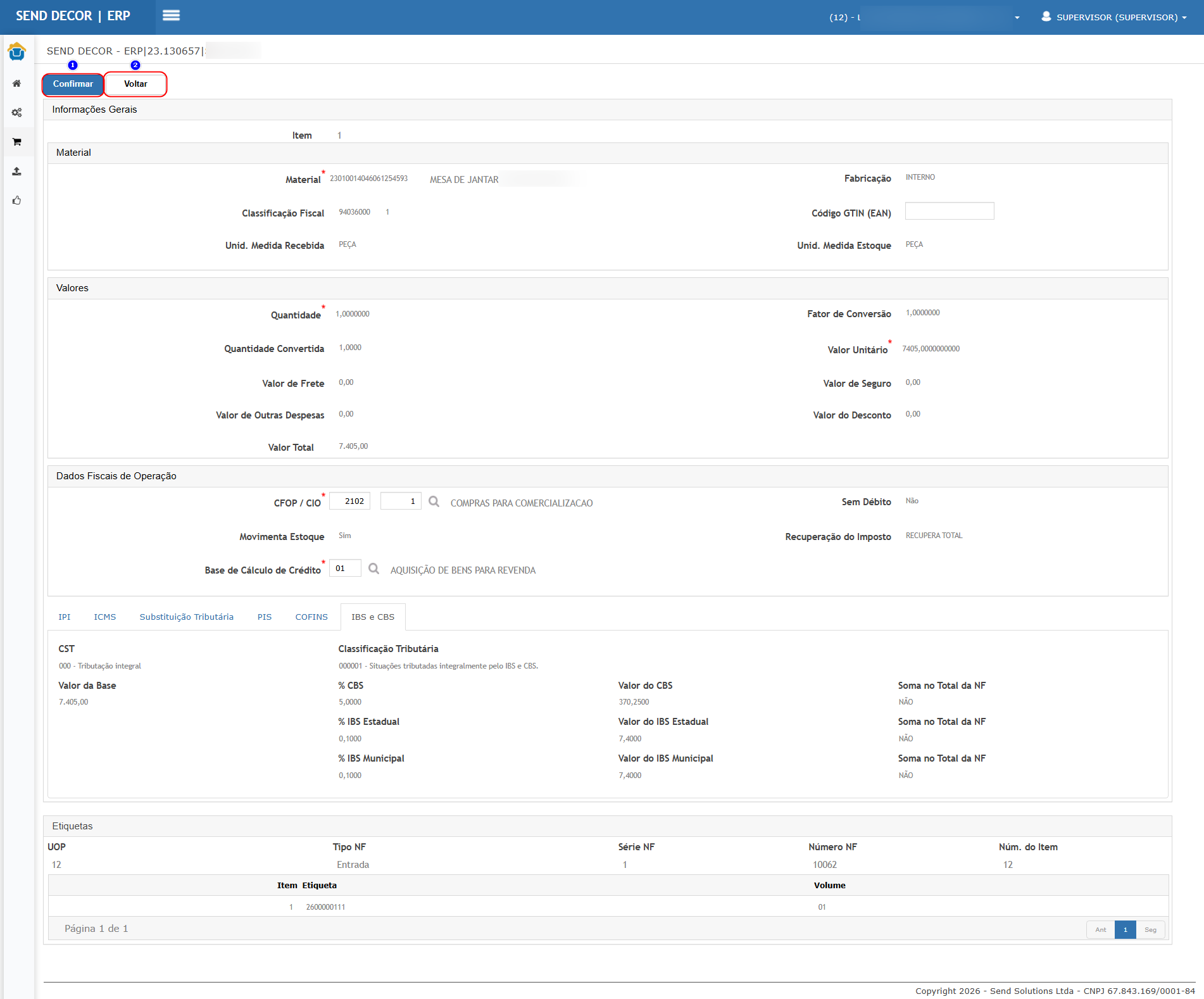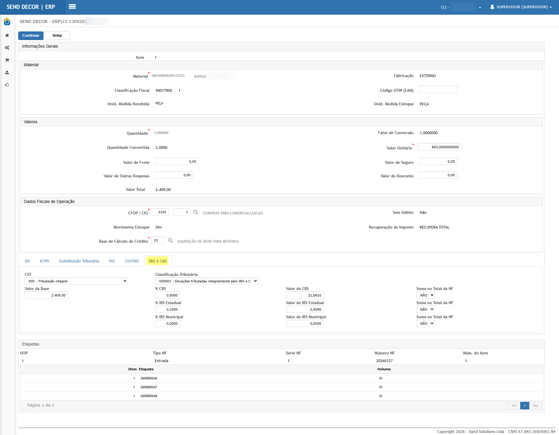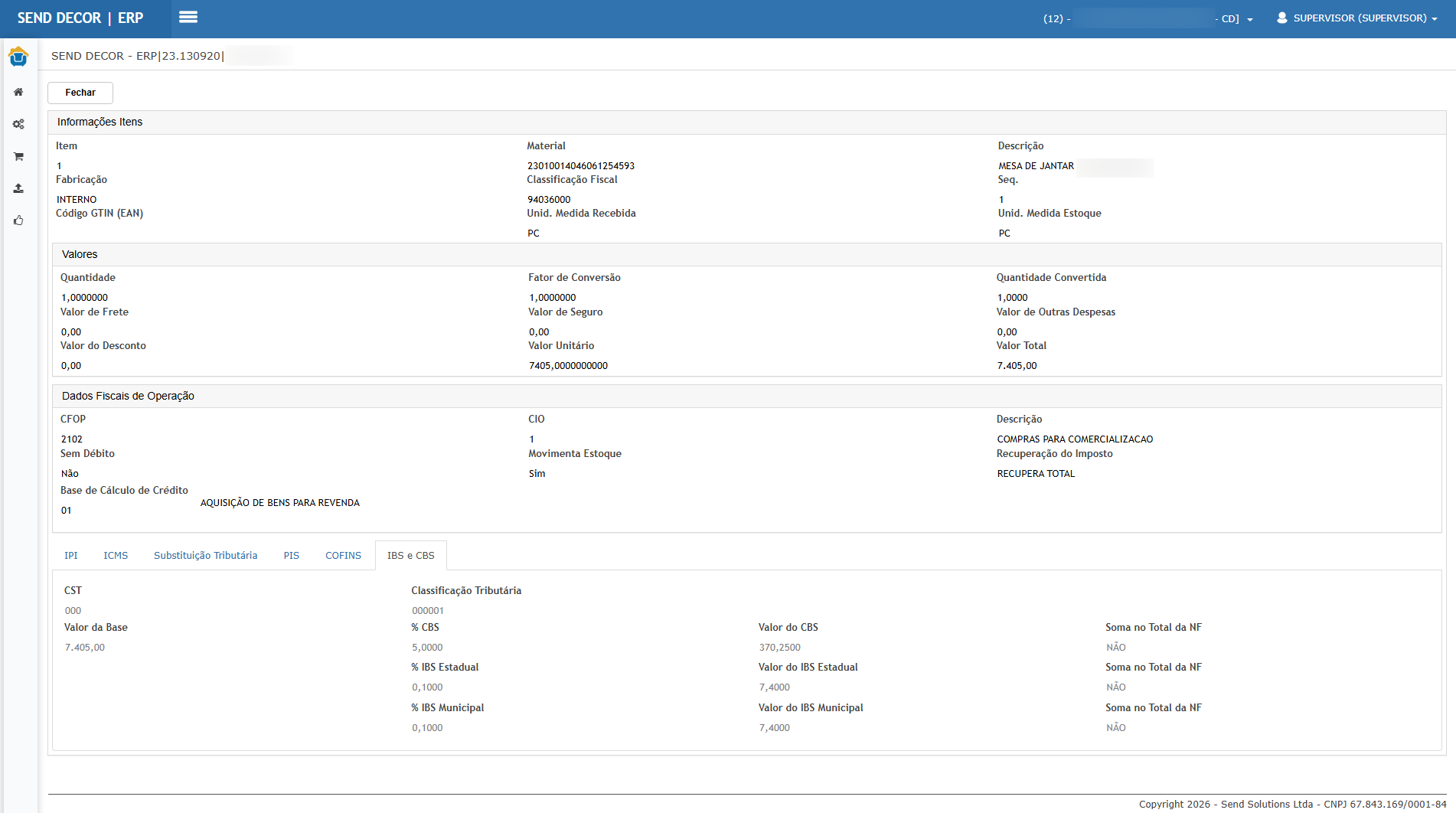 Resultado esperado: existe nova aba no item exibindo os novos impostos (IBS/CBS) com os mesmos valores do XML.
