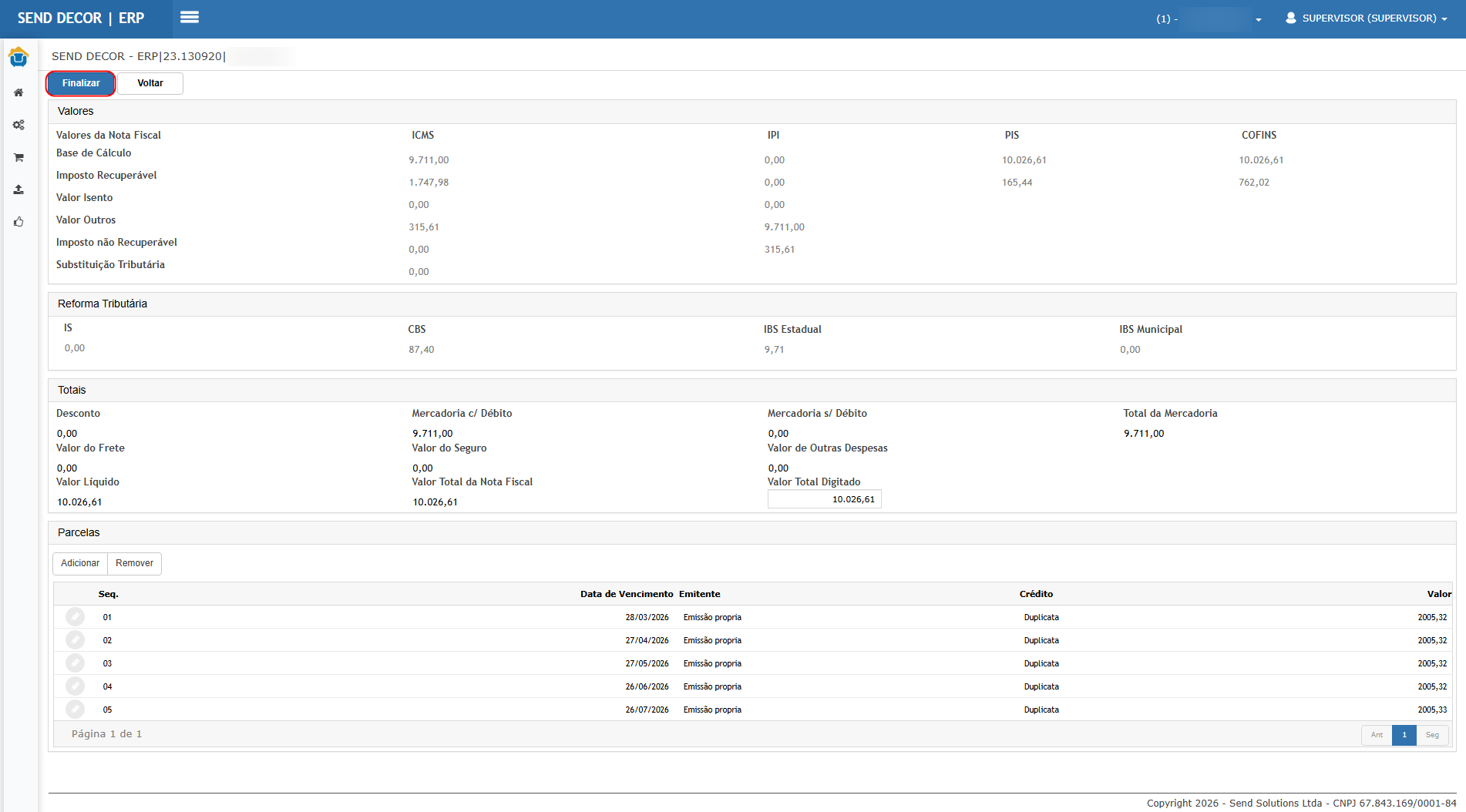 Cenário 02 — Recebimento manual (Inserir) calculando novos impostos pela parametrização Fiscal