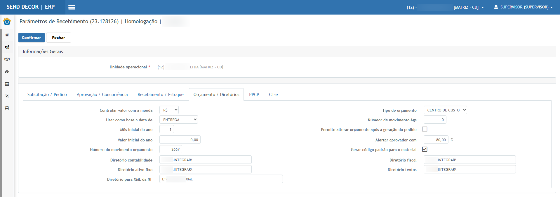 Acessar: Corporativo > Configuração empresa > Parâmetro recebimento (editar na UOP que fará o recebimento).