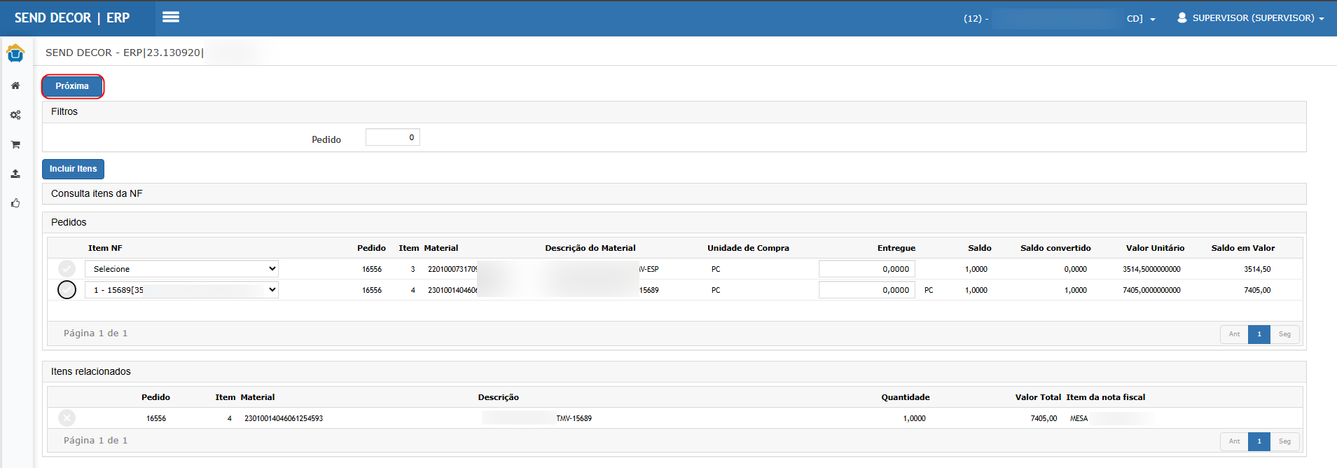 Informar quantidade entregue, selecionar o item e clicar em Próxima.