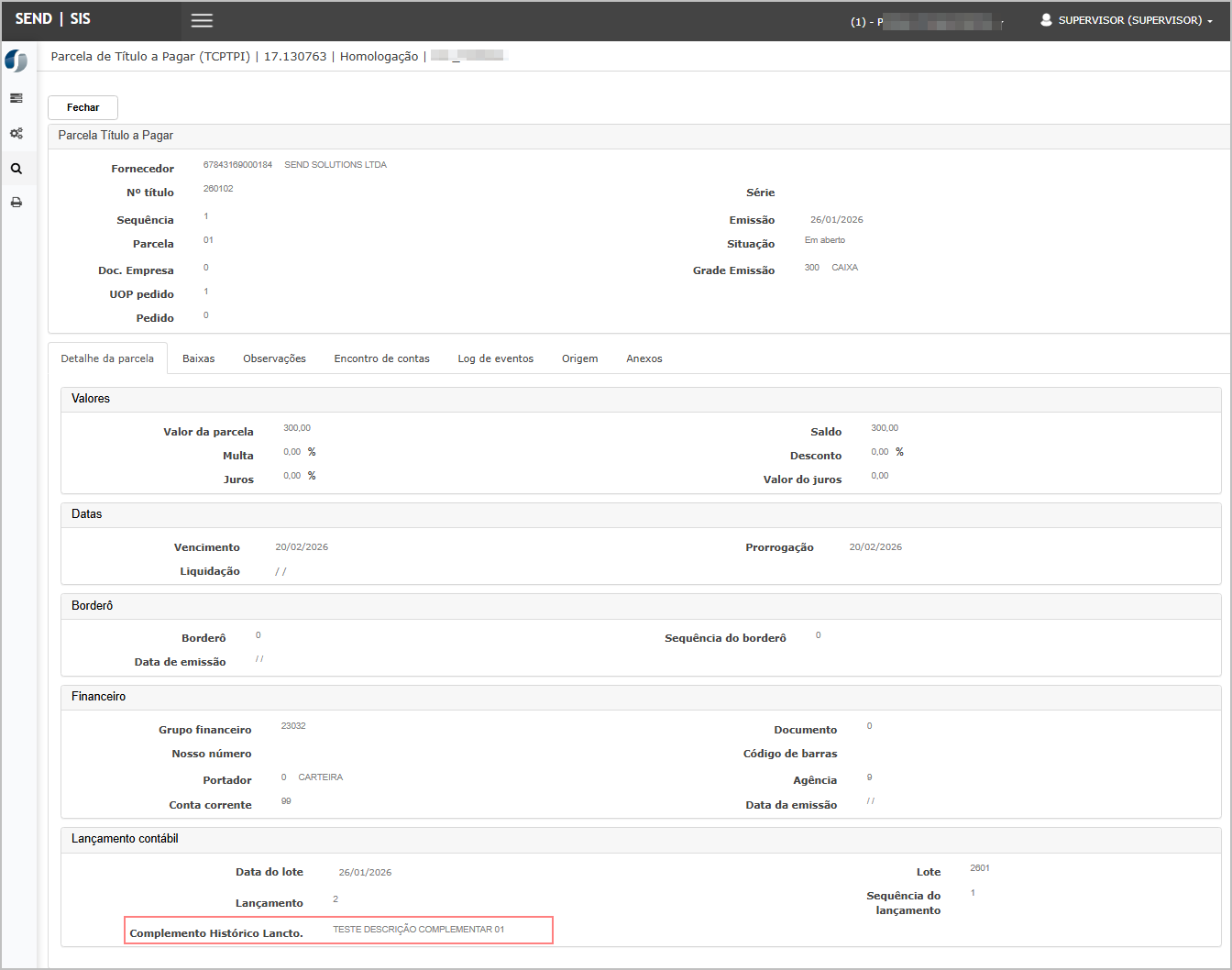 Resultado esperado: O sistema deve exibir no detalhe do título o complemento informado na inclusão, no campo “Complemento Histórico Lançto.”.