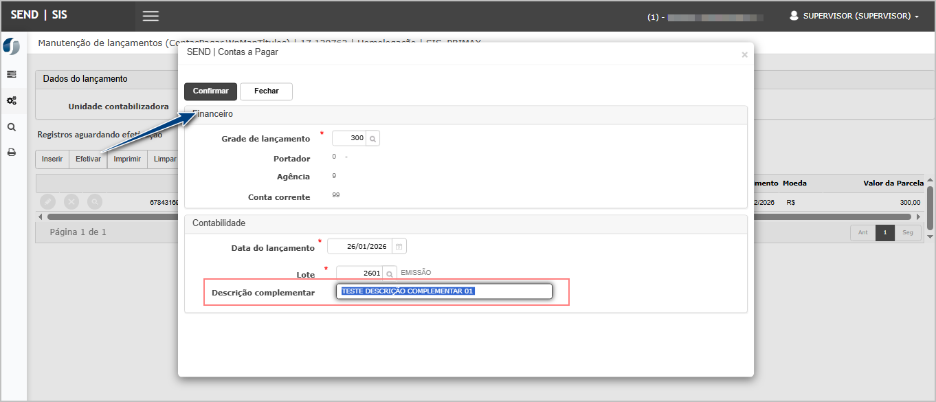 Na efetivação selecione a grade e lote do lançamento, na sequência informe a Descrição complementar.