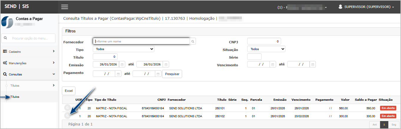 Acessar Contas a Pagar > Consultas > Títulos (consulta de títulos a pagar).