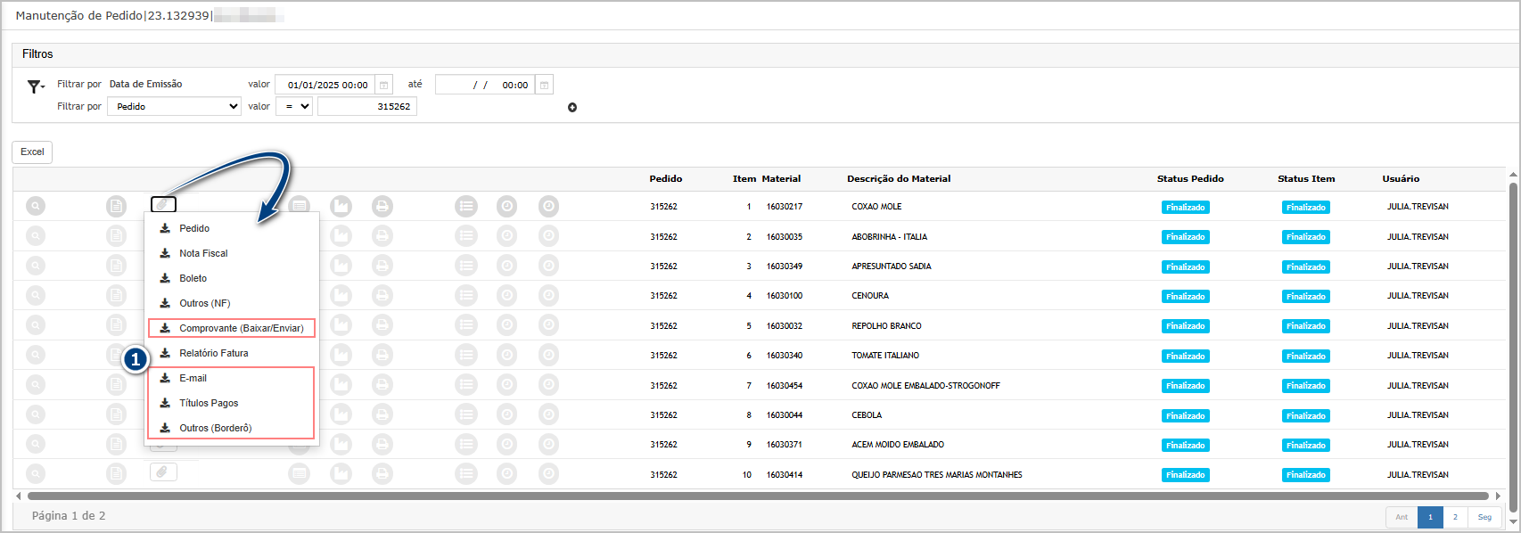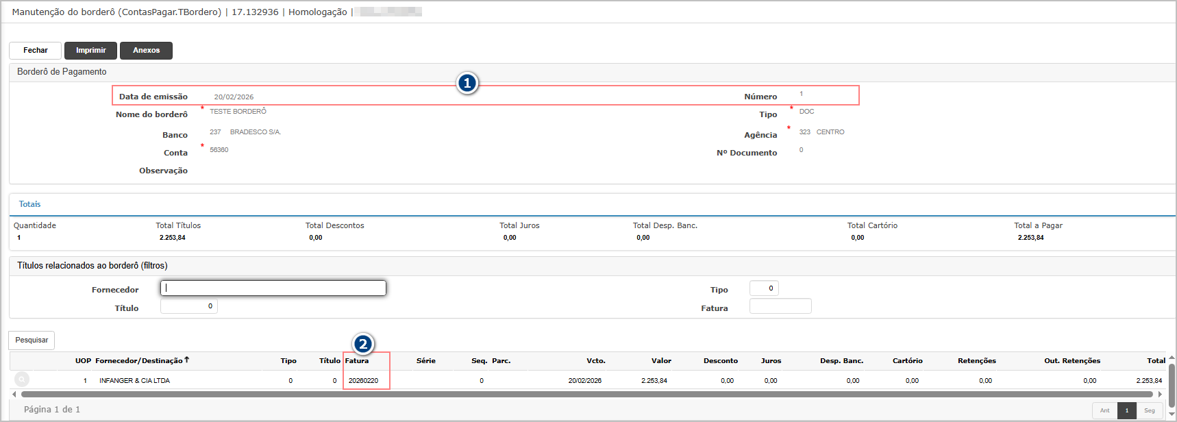Na tela de consulta do borderô (1), verifique qual fatura (2) está relacionada ao borderô.