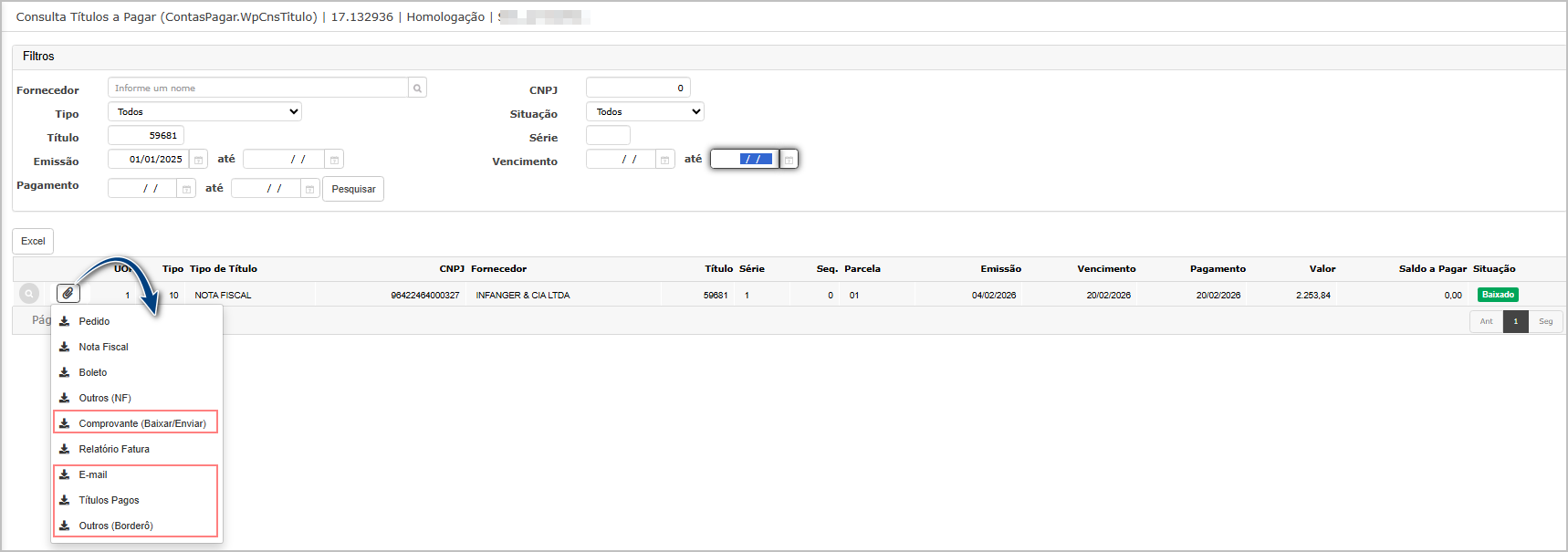 Acessar: Contas a Pagar → Consulta de Títulos