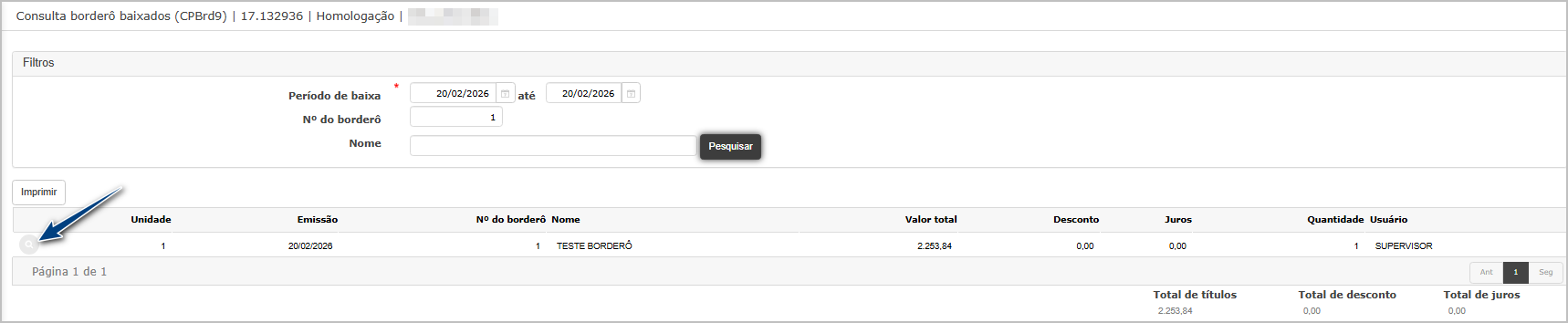 Na tela principal de consulta, utilize o filtro para encontrar o borderô desejado.