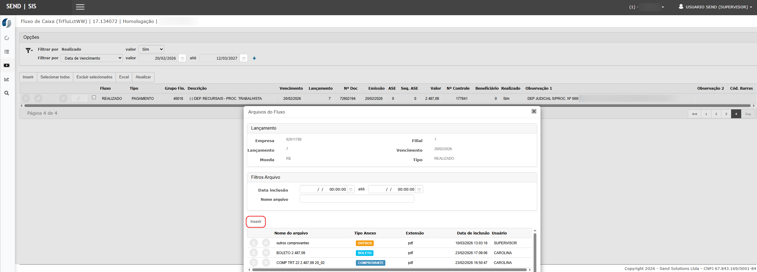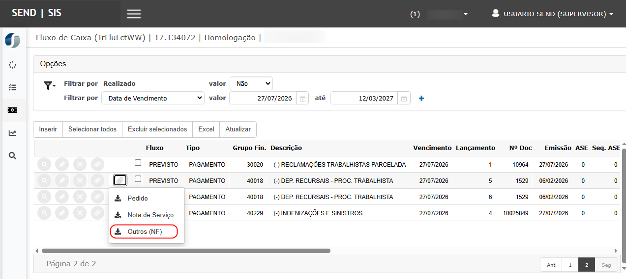 No grid do fluxo de caixa, identificar a opção Comprovante (SisPag).