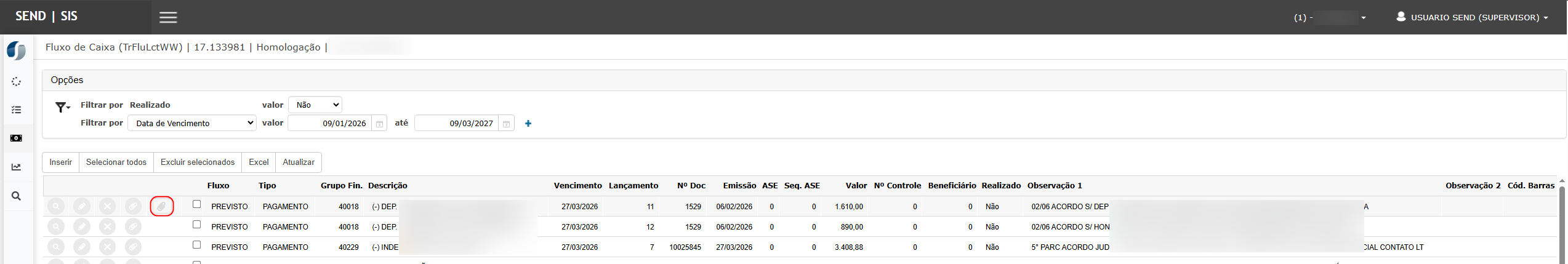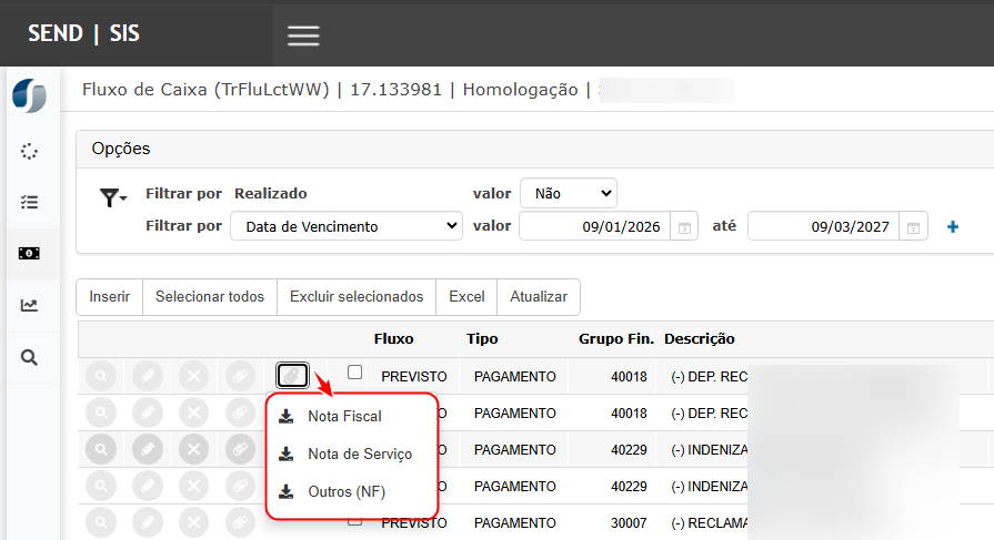 Na tela Fluxo de Caixa, localizar um lançamento que possua anexos vinculados.