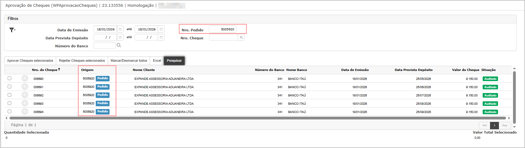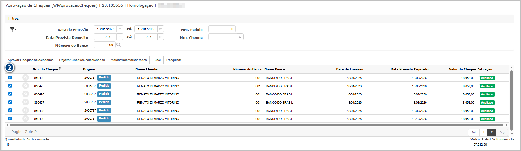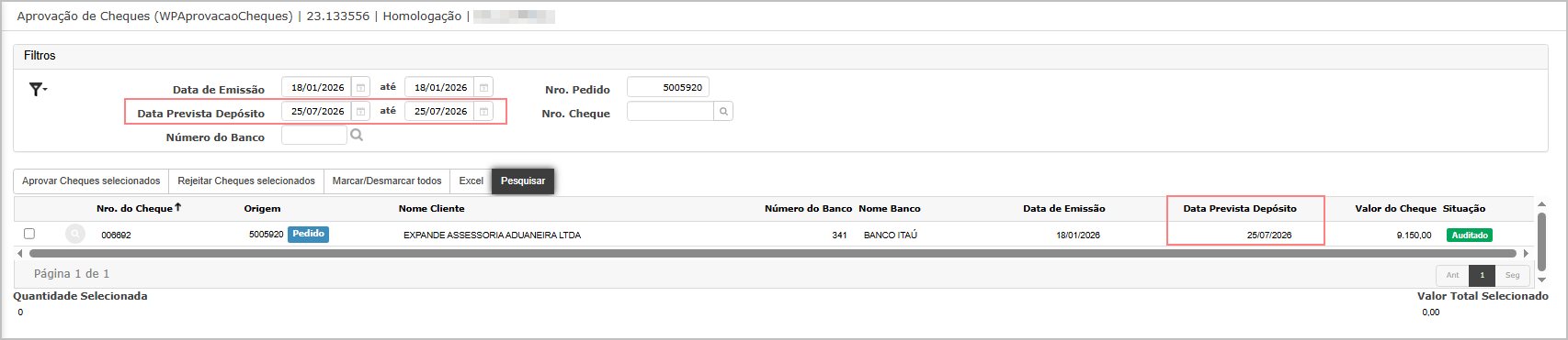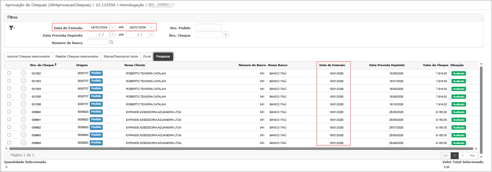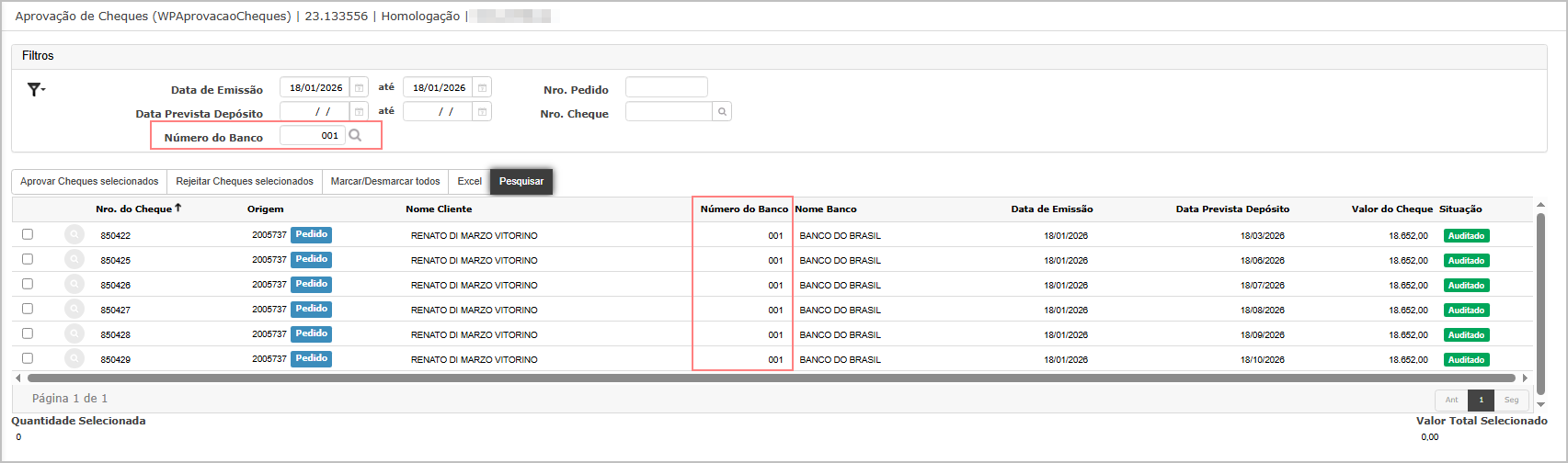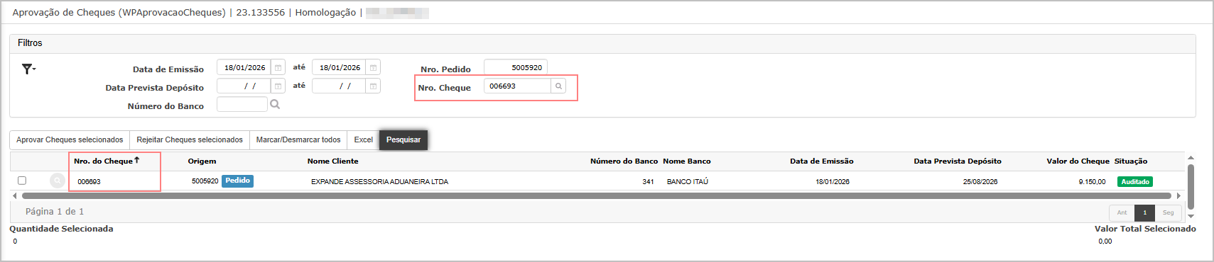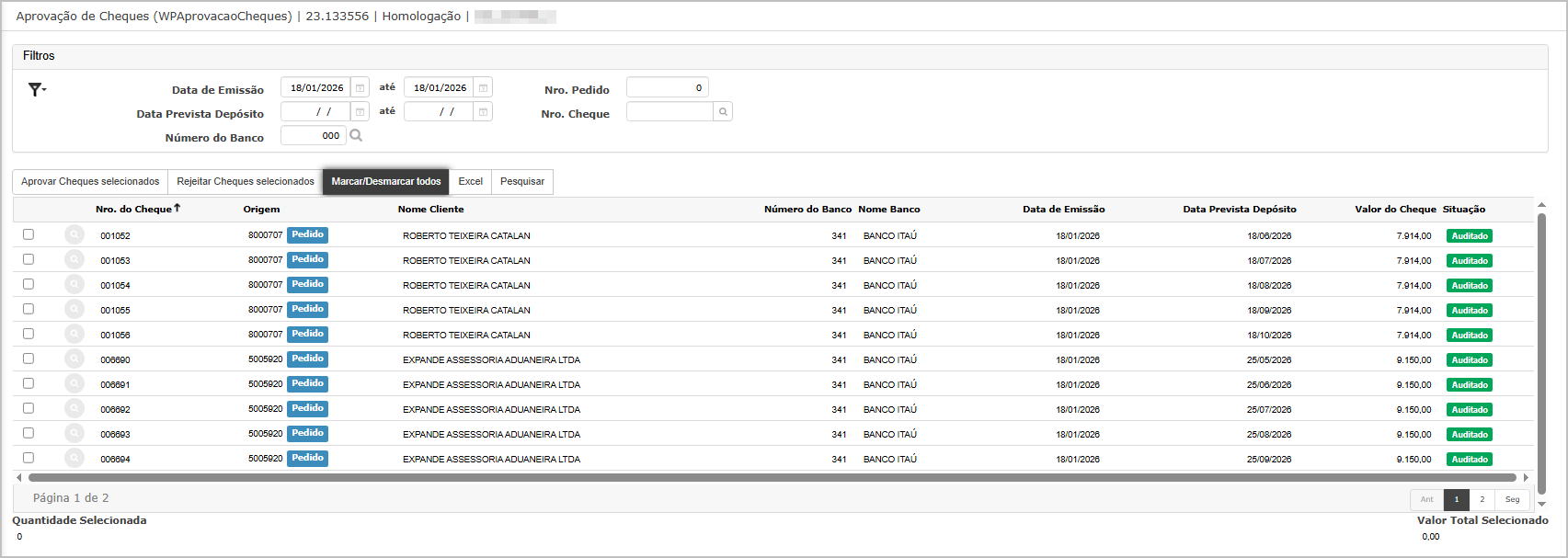 Objetivo: Validar o funcionamento da seleção em massa na tela Aprovação de Cheques.