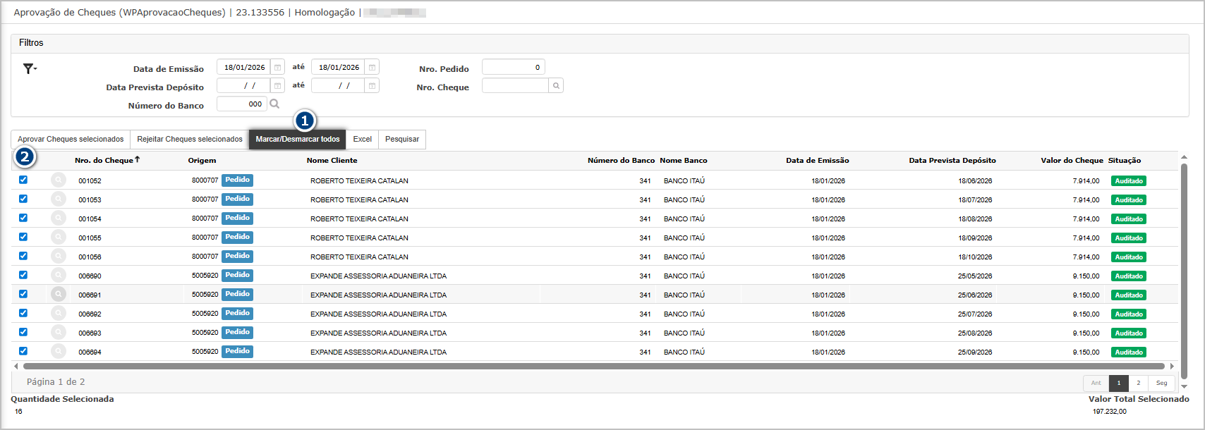 Na tela principal, clique no botão Marcar/Desmarcar todos (1), todos os registros carregados devem ser marcados (2) em todas as páginas.