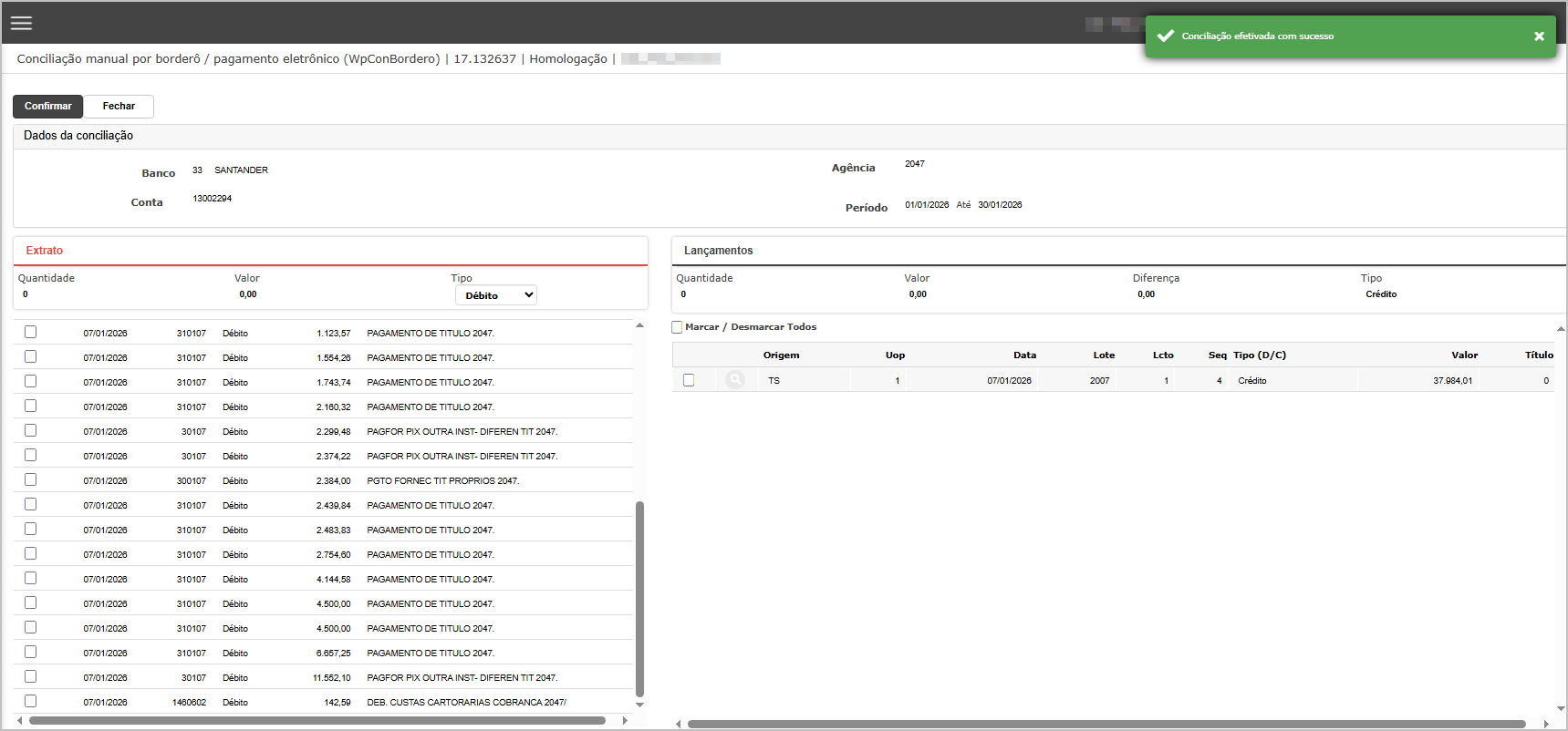 Objetivo do cenário: Validar que a consulta de lançamentos para conciliação apresenta informações únicas, sem repetição de valores.