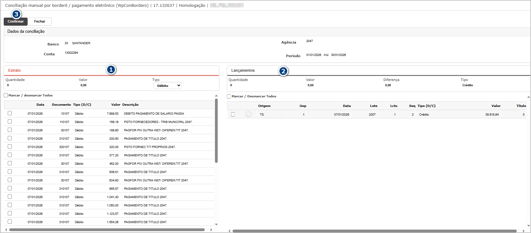 Para efetuar a conciliação, marque o item do extrato (1) e o lançamento (2), após clique em Confirmar (3).image.png