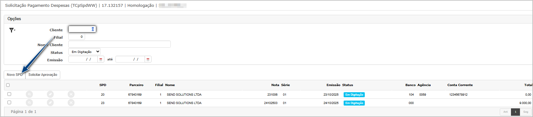 Ao entrar na tela principal, clique que Novo SPD.