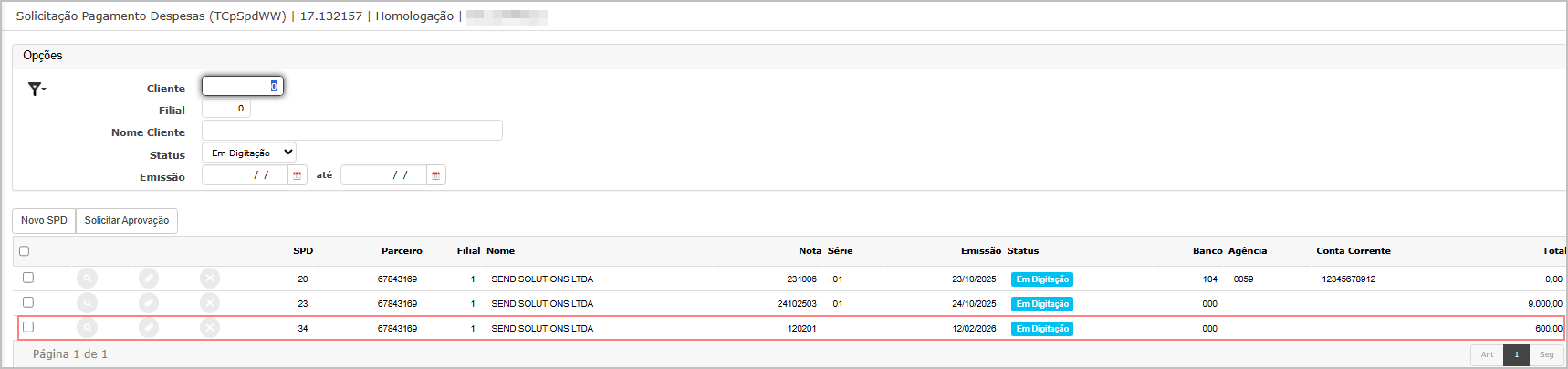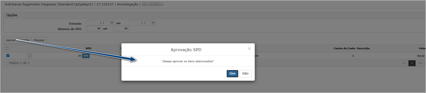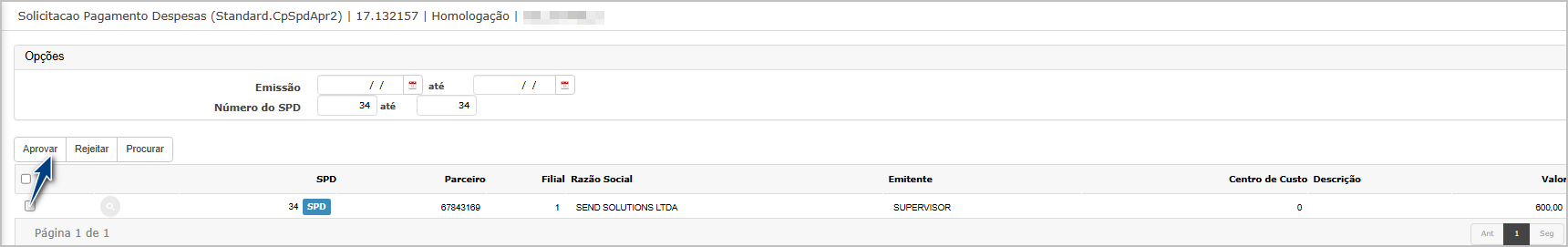 Ao entrar na tela principal, utilize os filtros para encontrar o SPD que será aprovado, selecione e clique em Aprovar.