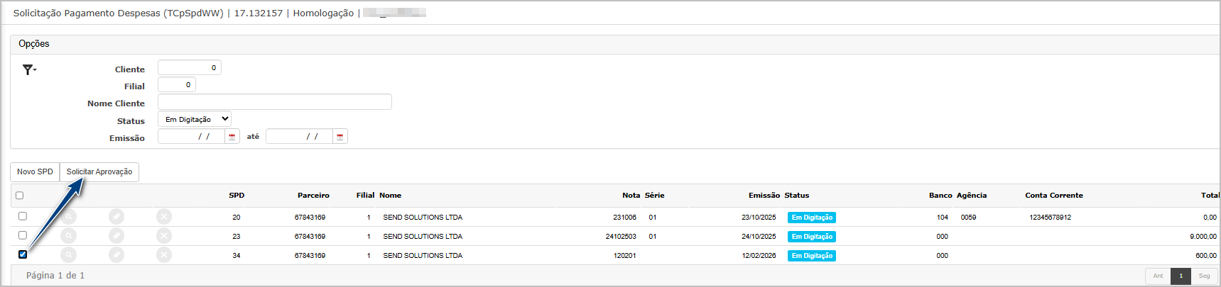 Ao entrar na tela principal, clique selecione o SPD e clique em Solicitar Aprovação.
