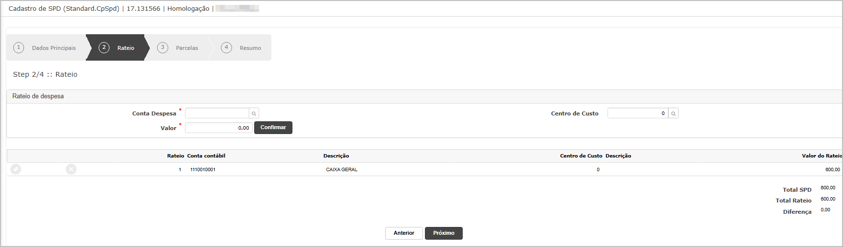 No rateio informe a conta e clique em próximo.