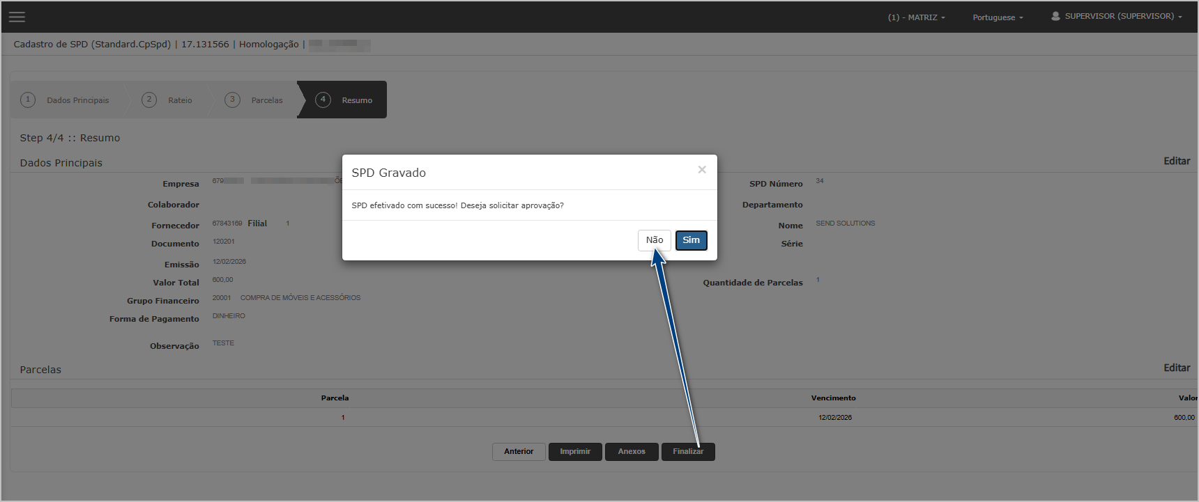 No resumo, verifique as informações e clique em Finalizar, no pop-up clique em Não.