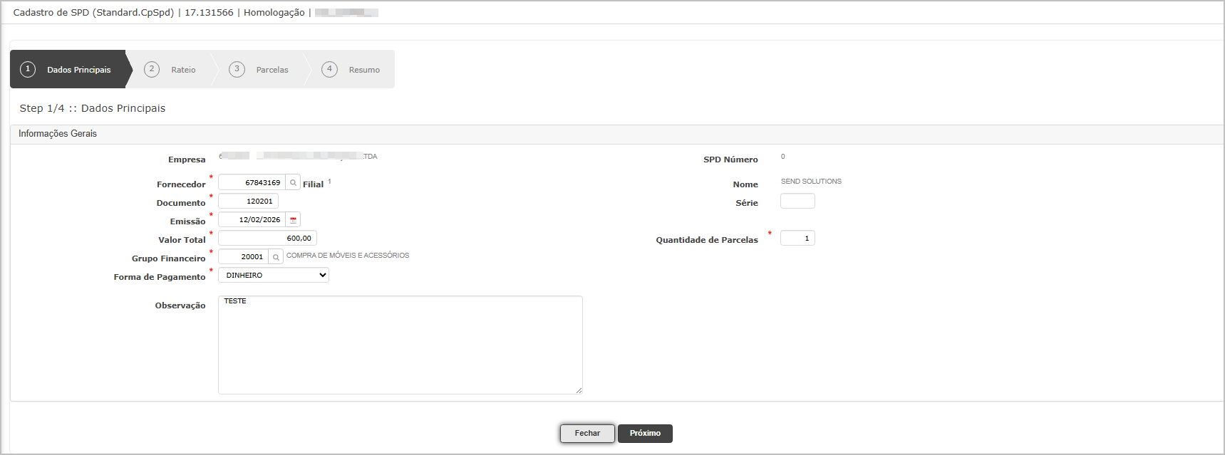 Ao abrir a tela, insira os dados principais do SPD. Ao finalizar clique em Próximo.