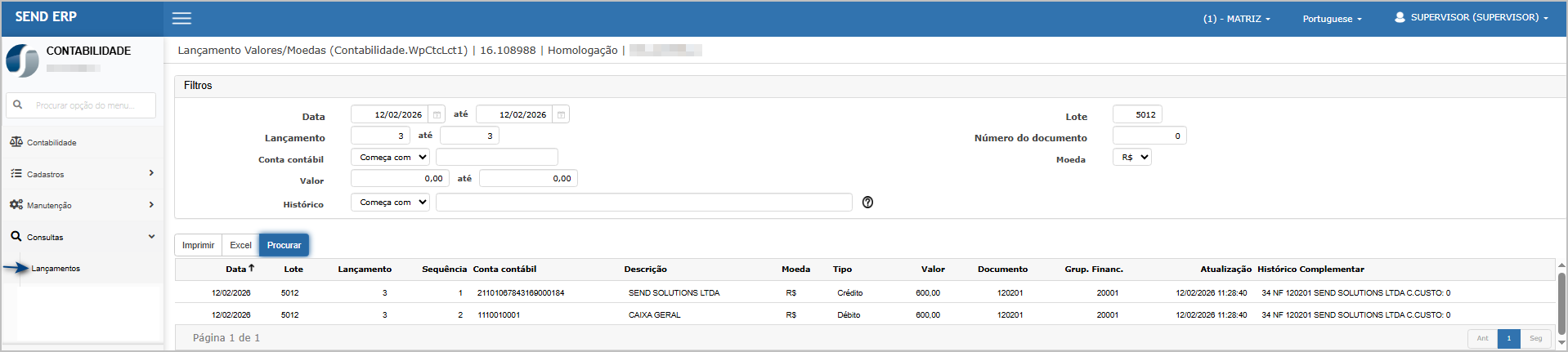 Consulta do lançamento na Contabilidade.