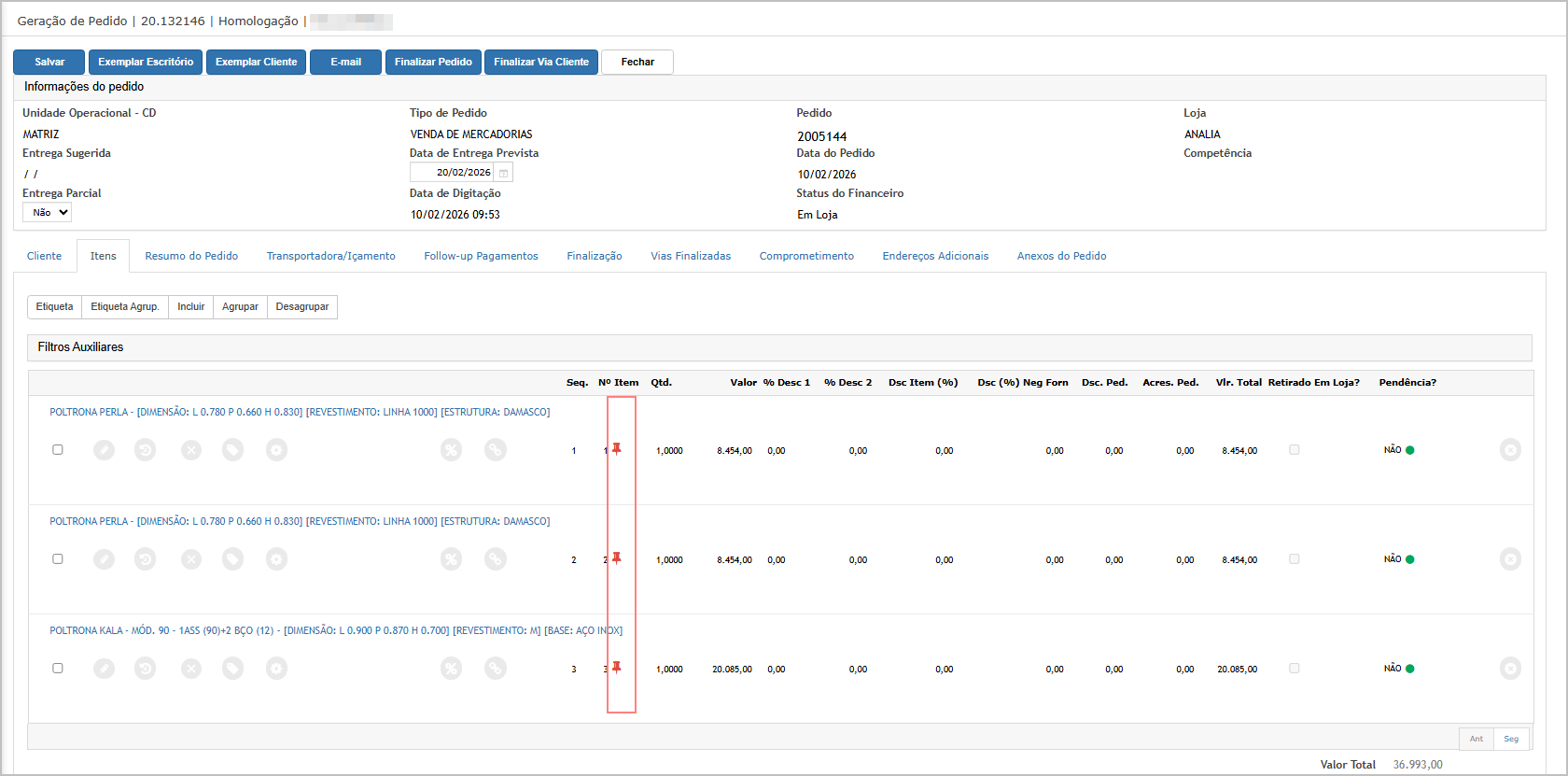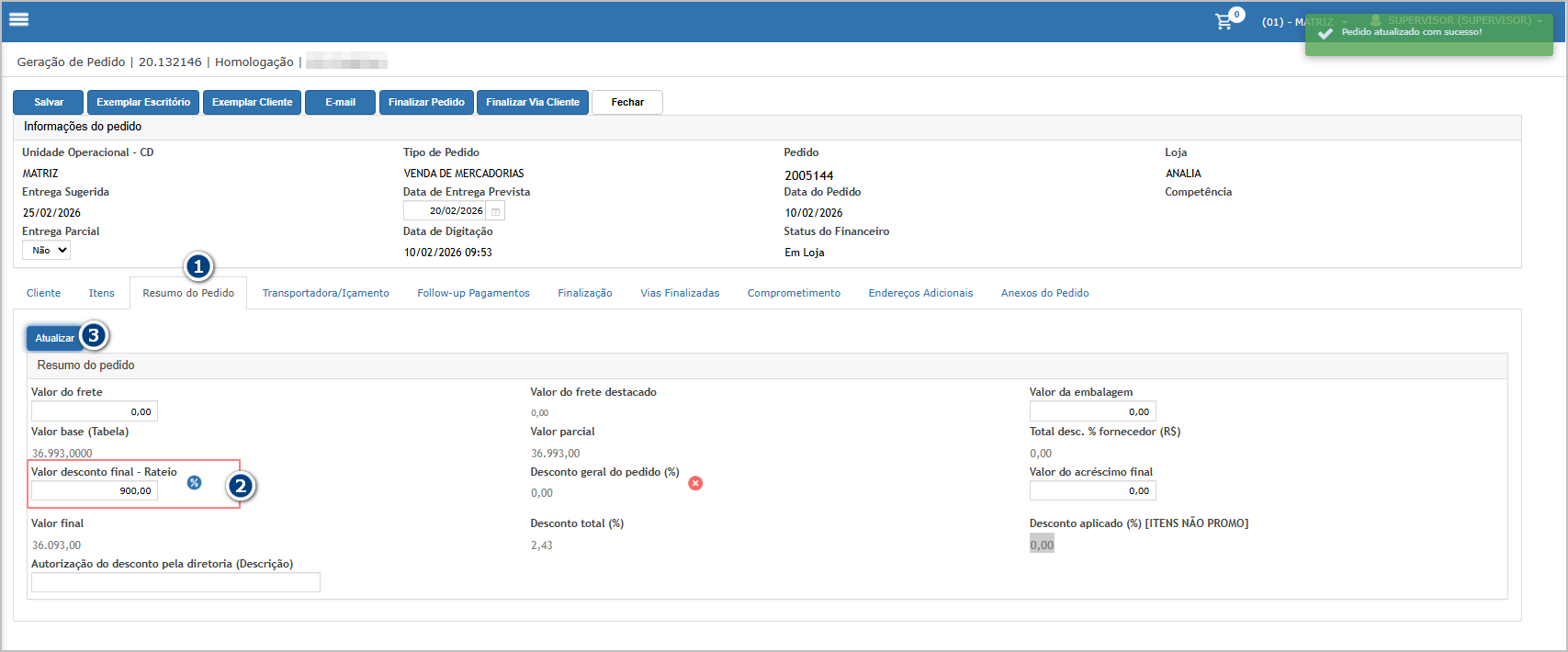 OFinalizarvalorainformadosolicitaçãofica vinculado ao pedido; A partir desse momento, os descontos aplicadosclicando emitens promocionais passam a respeitar o limite configurado.