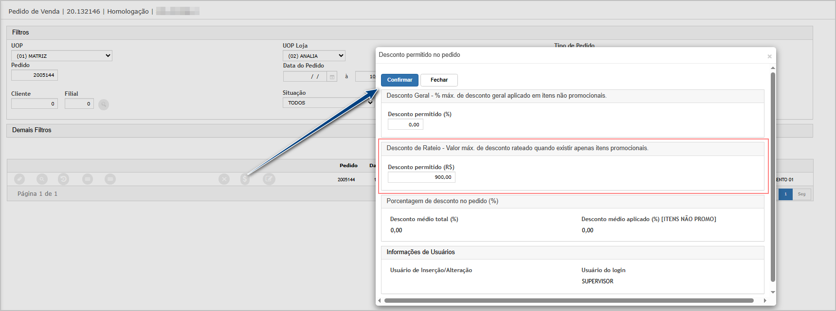 Na tela principal, encontre o pedido e clique no botão Liberação de Desconto.Informe no campo de desconto permitido o valor máximo de desconto que será aceito no pedido.