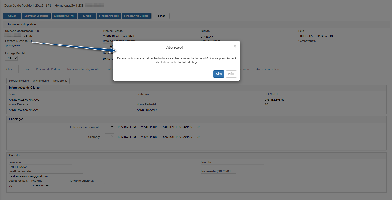Para isso, foi criada uma nova funcionalidade no pedido de venda que permite atualizar a data de entrega sugerida, garantindo maior flexibilidade ao processo comercial e evitando inconsistências na previsão de entrega ao cliente.
