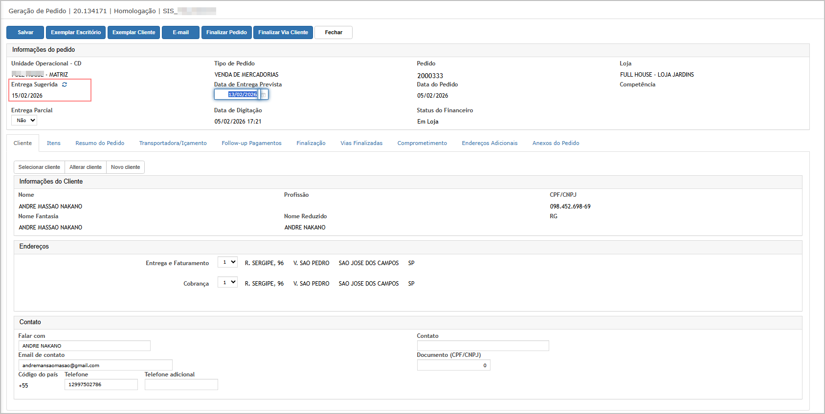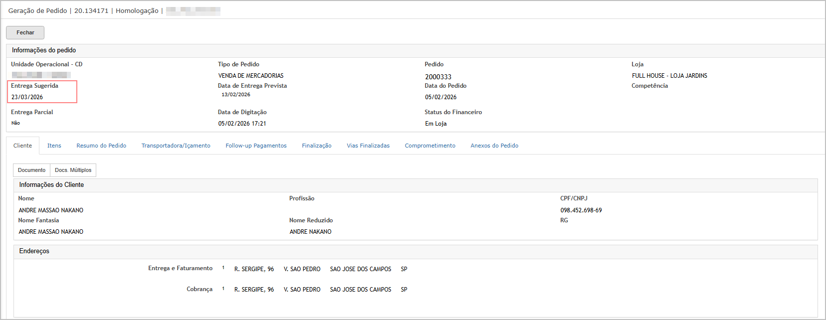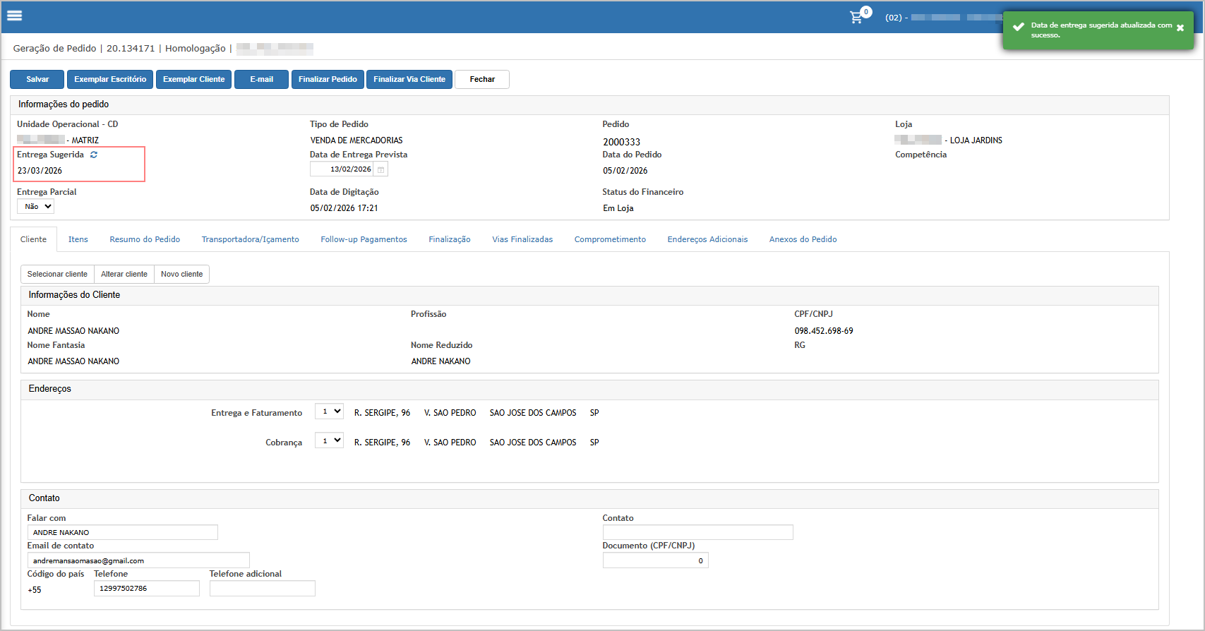 Consulta do pedidos após atualização da data de entrega sugerida.