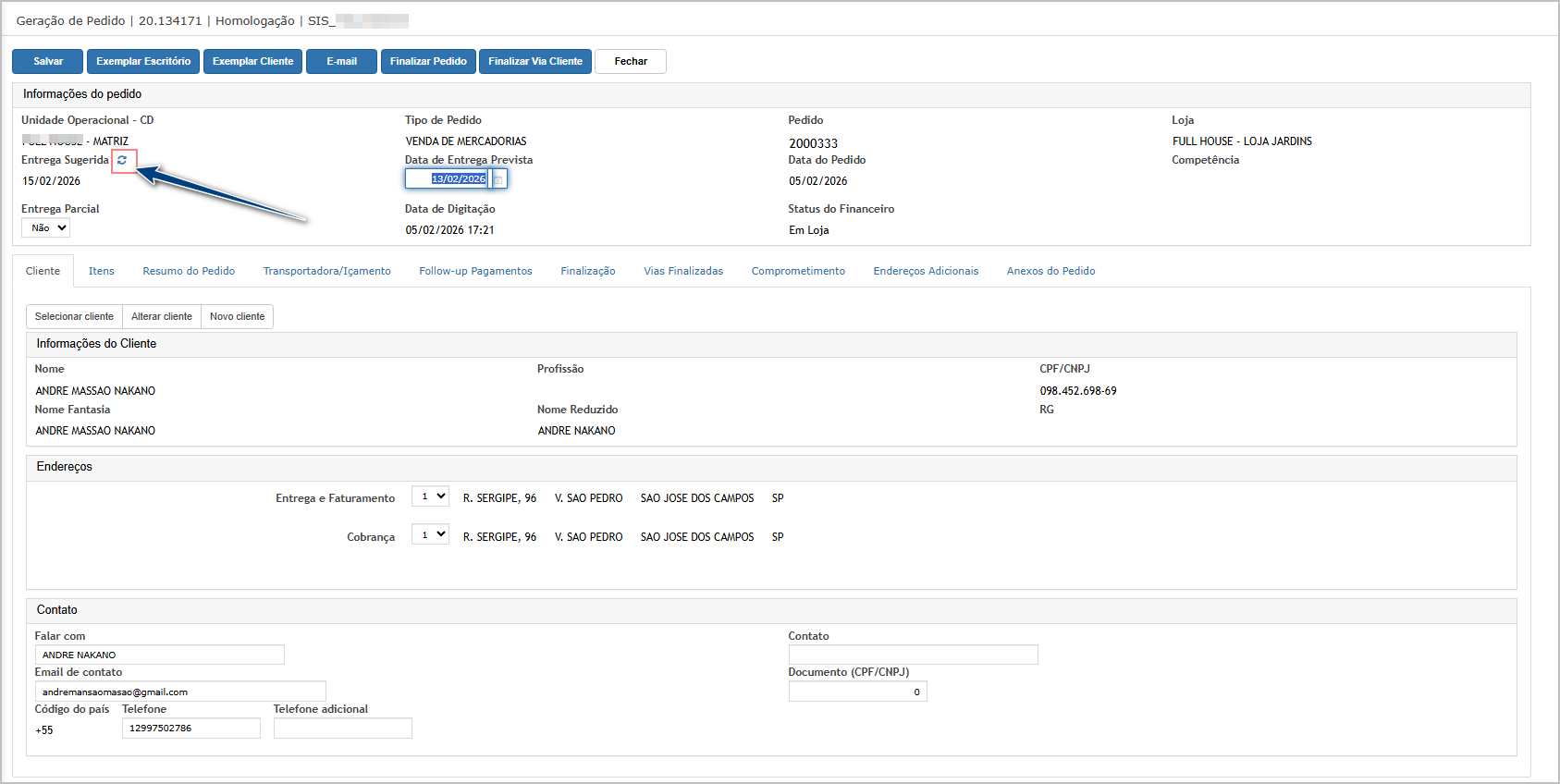 A tela do pedido deve refletir a nova data informada pelo usuário.