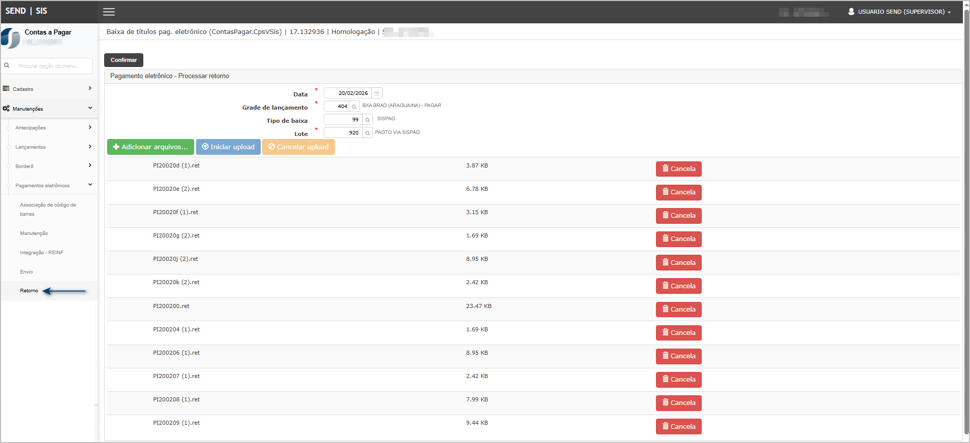 1. Acessar: Contas a Pagar → Manutenções → Pagamentos Eletrônicos → Retorno