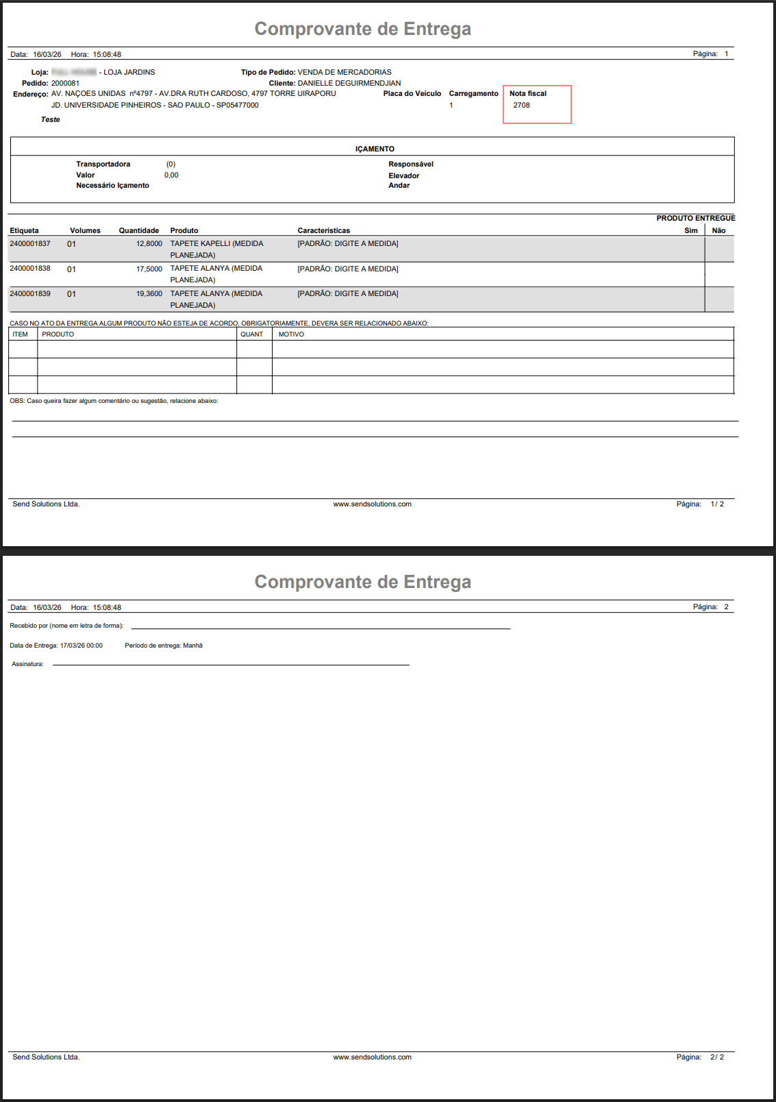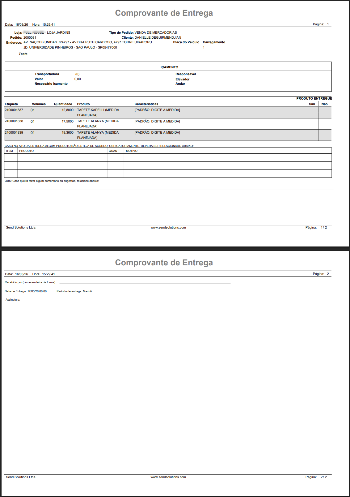 O relatório Comprovante de Entrega é gerado com sucesso.