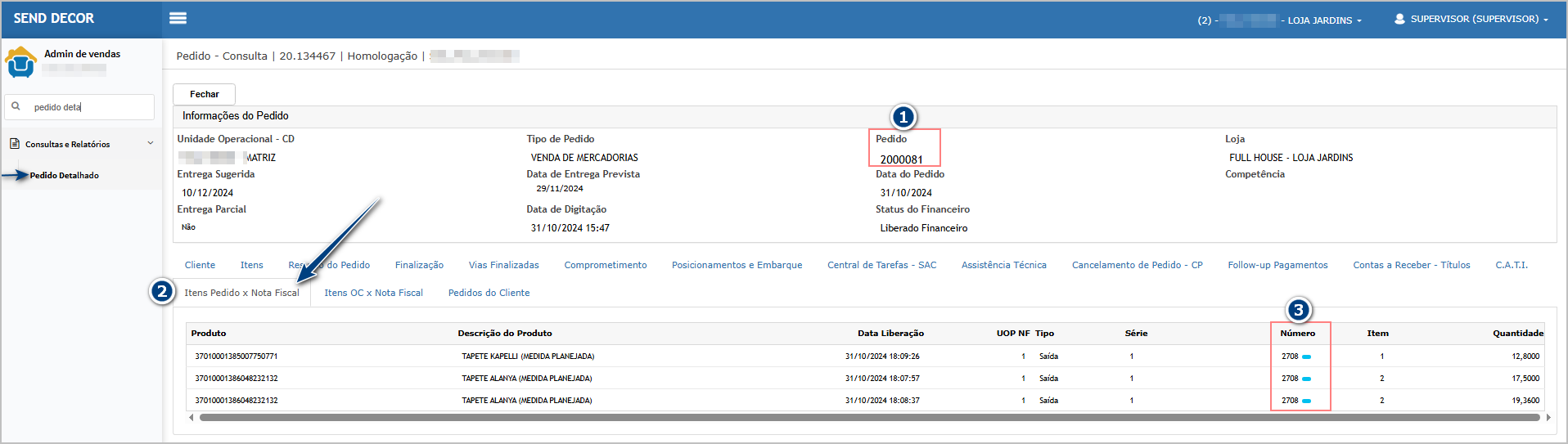 Na consulta do pedido (1), aba Itens Pedidos (2), é possivel verificar o número da nota fiscal relacionada (3).