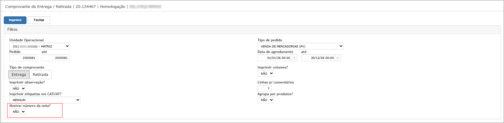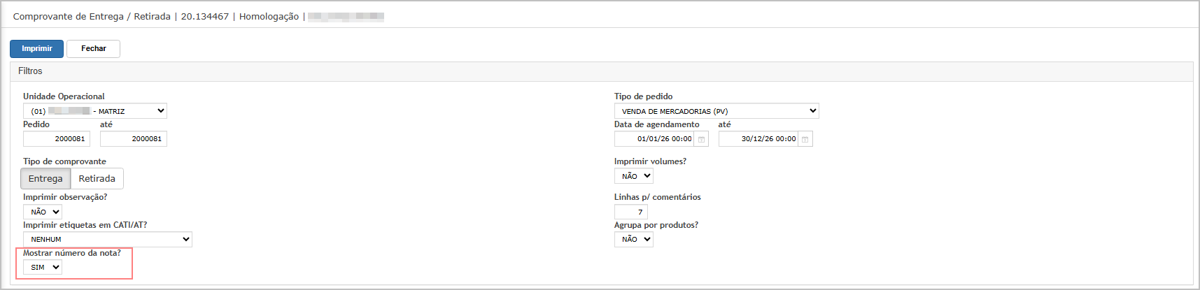 Na tela de filtros, note que há uma nova opção Mostrar número da nota?, neste exemplo vamos marcar Sim.