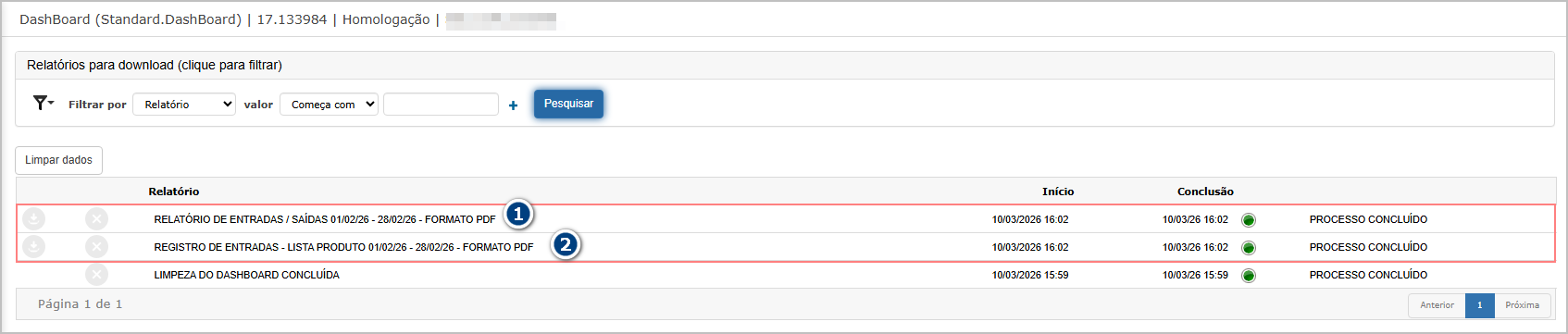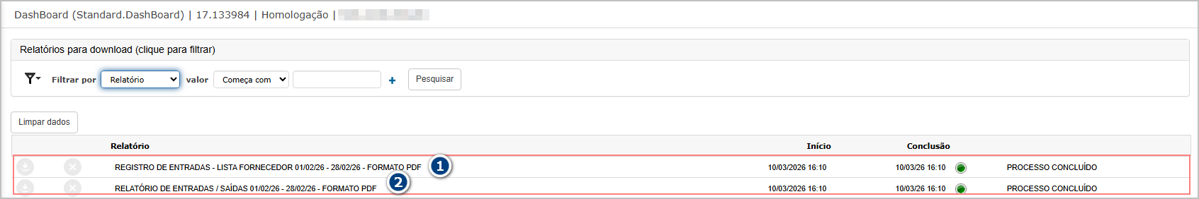 Após confirmar a geração do relatório, o sistema direcionará para dashbord, onde é possivel baixar o relatório. O resumo por fornecedor é gerado em um arquivo PDF separado no dashboard.
