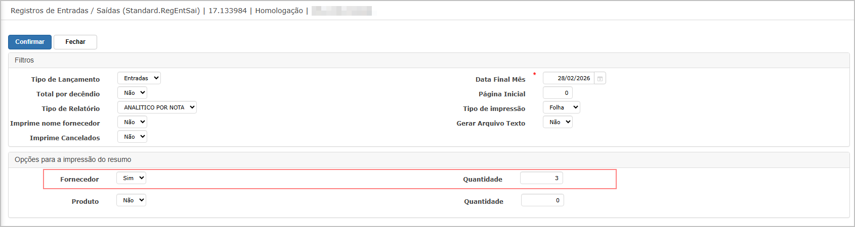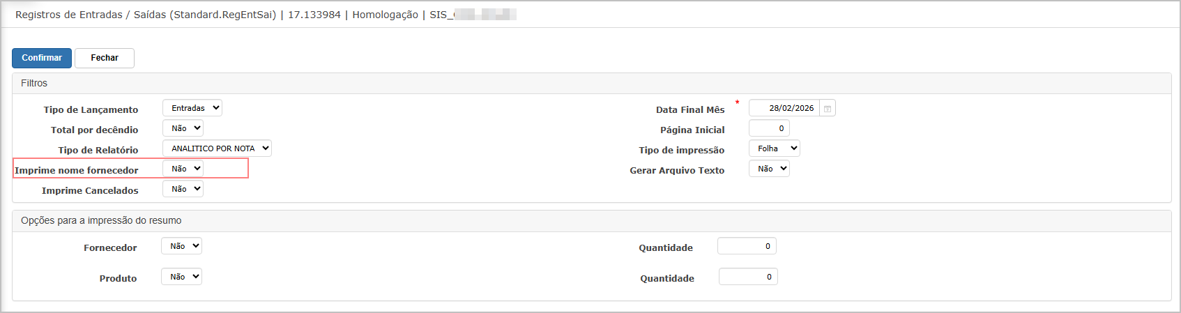 Objetivo: Validar a implementação da opção de imprimir o nome do fornecedor nos registros de entrada.