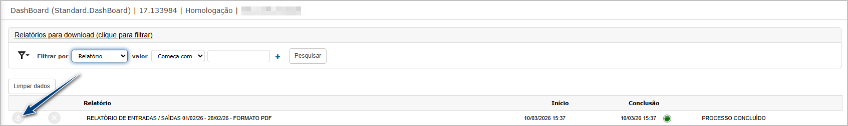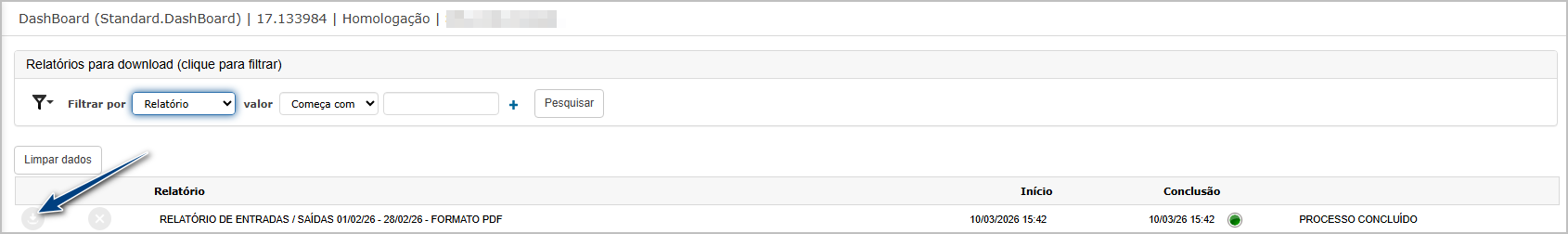 Após confirmar a geração do relatório, o sistema direcionará para dashbord, onde é possivel baixar o relatório.