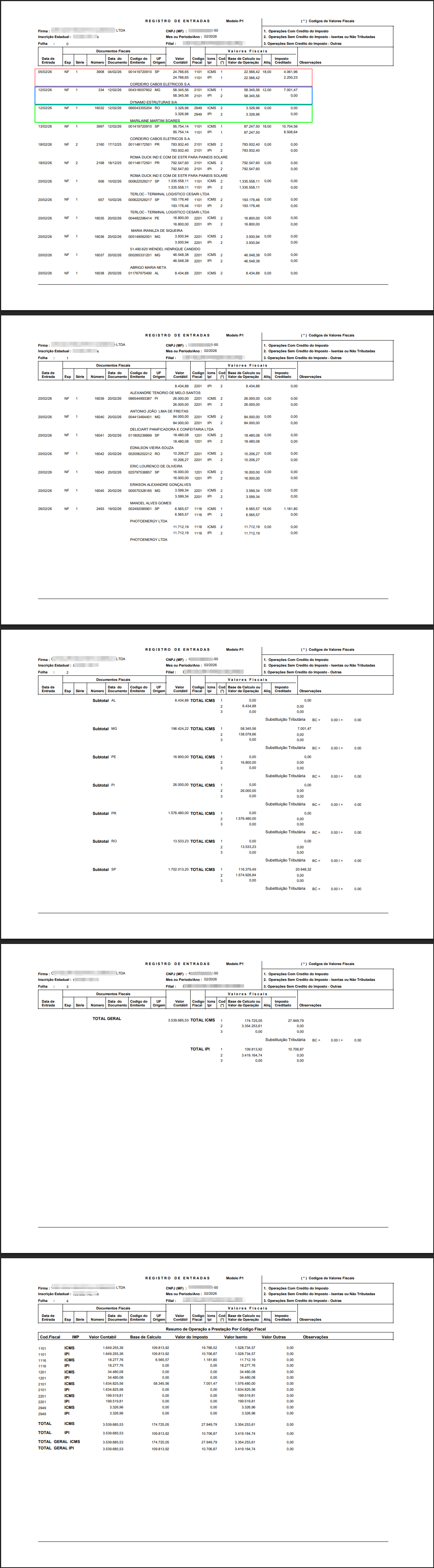 As informações aparecem alinhadas com os documentos de entrada correspondentes.